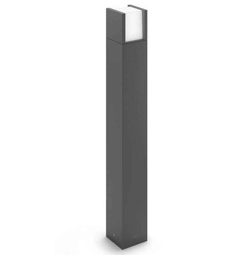 Sloupové venkovní LED světlo Philips Arbour v antracitově šedé barvě je tvořeno kostkou světla zasazenou do odolného, tlakově litého hliníkového rámu. Důmyslný design vyzařuje paprsky rozptýleného hřejivého bílého světla podél cest a venkovních otevřených prostorů.