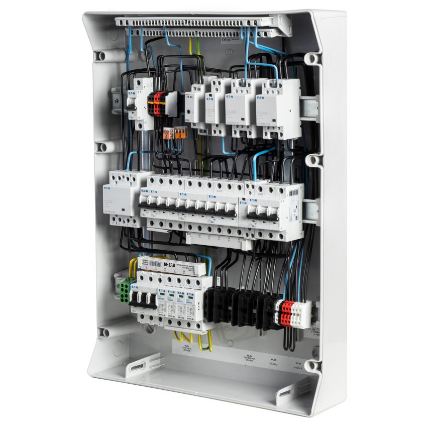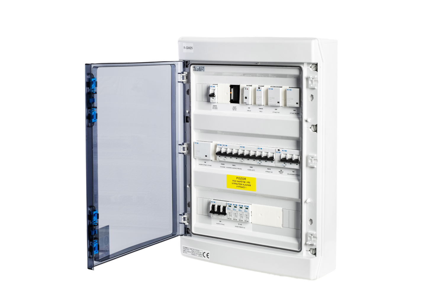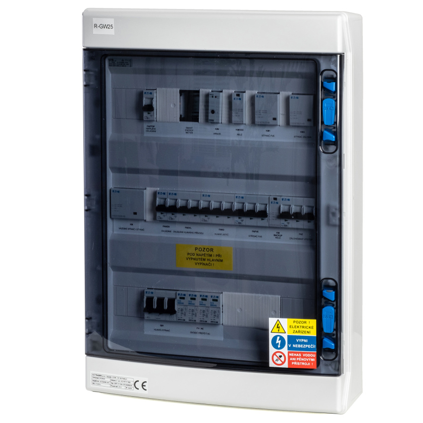 AZT AC rozváděč pro FVE, 3fázový, hlavní jistič 25 A, montáž na zeď, krytí IP65, kompletně osazený přepěťovou ochranou T1+T2, jističi a stykači, připravený pro funkci automatického přepínání sítě/zálohy. Záruka 24 měsíců výrobcem.
