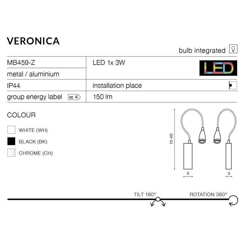Uvnitř svítidla se skrývá integrovaný LED zdroj s příkonem 1 x 3 W se svítivostí 150 lm a teplotou chromatičnosti 3000 K. Tento LED zdroj šetří elektrickou energii a zaručuje dlouhou životnost. Krytí IP20 je vhodné pro použití do interiéru.