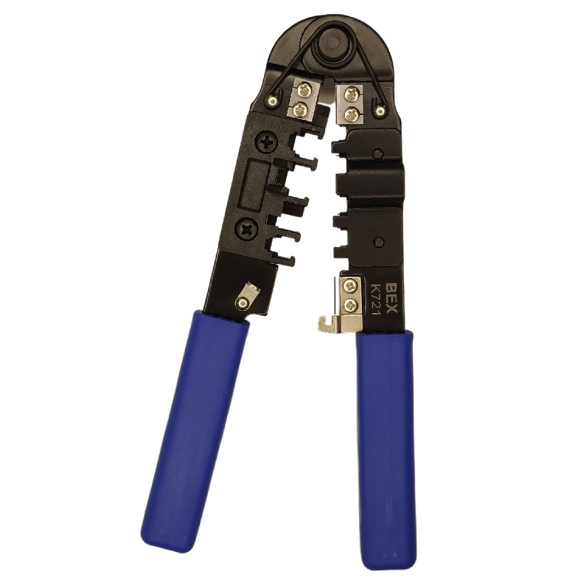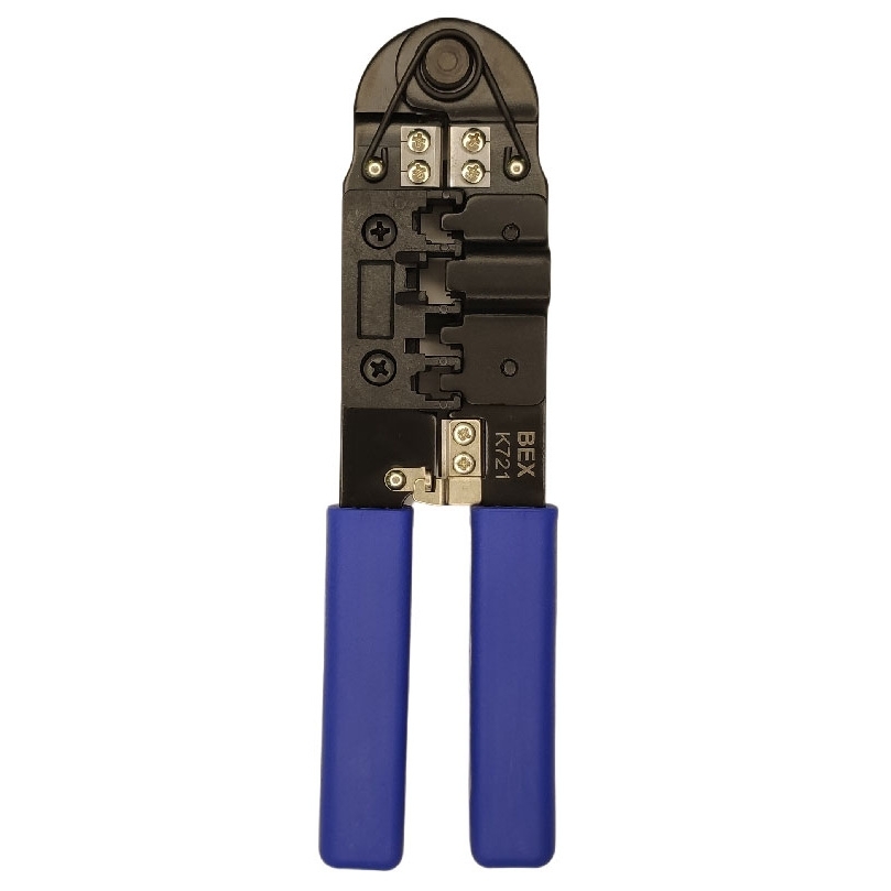 K721 - Univerzální krimpovací nástroj pro krimpování nestíněných 4P, 6P, 8P, 6DEC modulárních konektorů s integrovanou možností řezání a odizolování kabelů.