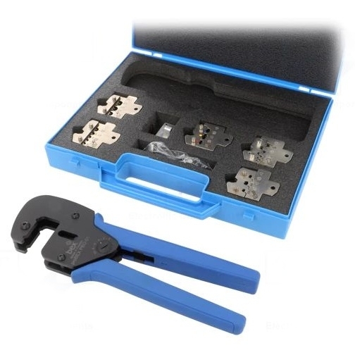 Krimpovací kleště s otevřeným rámem a pěti vyměnitelnými čelistmi v kufru