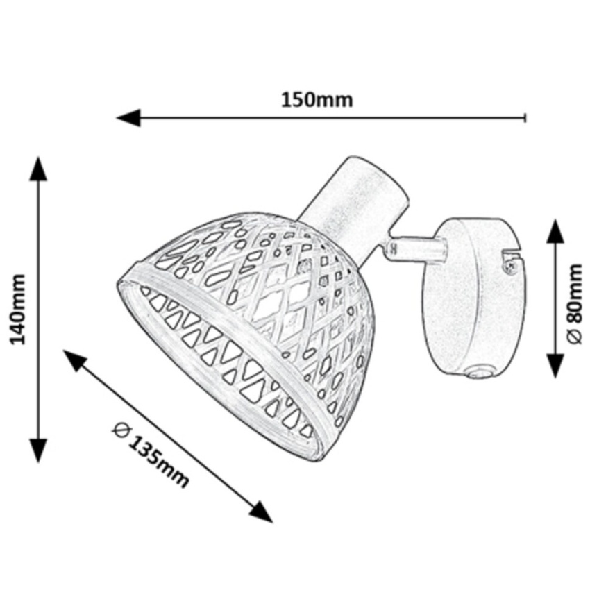 Bodové svítidlo Rattan v industriálním stylu doporučujeme do různých místností vašeho bytu: můžete jej namontovat do obývacího pokoje, jídelny, kuchyně nebo i do ložnice. Matné černé kovové svítidlo je doplněno o stínidlo ve tvaru deštníku z přírodního ratanu. Svítidlo lze upevnit na zeď pomocí kulatého dekoračního podstavce. Svítidlo Rattan lze použít s jednou žárovkou o výkonu až 15W. Typ patice je E14. V závislosti na vašem vkusu a místnosti, kde budete svítilnu instalovat, si můžete zvolit zdroj světla v teplé nebo přirozené bílé barvě. Pokud jej umístíte například do ložnice, jeho použití se žárovkou vyzařující teplé bílé světlo vám pomůže vytvořit útulnou, intimní atmosféru. Toto bodové svítidlo lze ovládat pomocí kolébkového spínače na spodní části ozdobného podstavce. Rozměry svítidla Rattan jsou následující: šířka 140 mm, průměr 135 mm, vzdálenost od stěny 150 mm, montážní průměr 80 ??mm. Tento model je dodáván bez světelného zdroje.