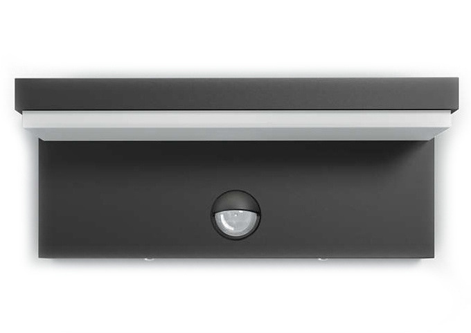 Nástěnné svítidlo s pohybovým IR senzorem Bustan z kolekce moderního osvětlení značky Philips dokonale osvítí exteriér Vašeho domu, chaty či garáže a díky svému nenápadnému designu splyne s okolím. Krytí IP44 jej chrání před stříkající vodou. Tělo svítidla ve tvaru L o rozměrech 9,2 x 22 x 7,8 cm je zhotoveno z odolného litého hliníku s antracitovou povrchovou úpravou doplněnou o bílý plastový difuzor. Svit zajišťuje integrovaný LED zdroj o příkonu 2 x 4,5 W s celkovou svítivostí až 1000 lm a teplotou chromatičnosti 4000 K. Senzor je umístěn v dolní části základny. Svítidlo je určeno k napájení ze sítě na 220-240 V