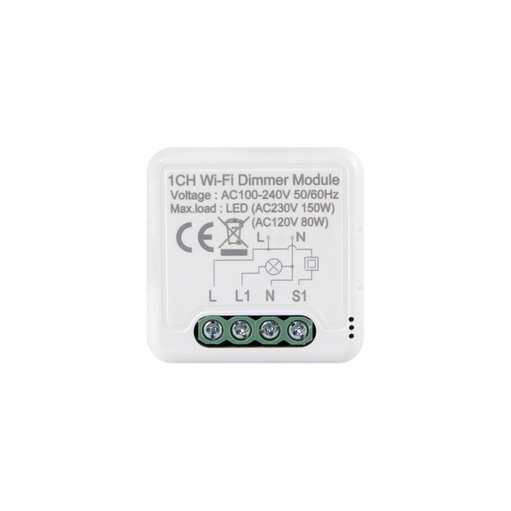 1Ch dimmer module WiFi Frequency: 2.4 GHz Network Protocol: IEEE802.11 b/g/n Rated Voltage: 100-240VAC Max load: LED (AC230V 150W) Working Temperature: -20°C ~ 50°C Dimensions: 39,2*39,2*18mm Frequency range: 2.412 - 2.484 GHz
