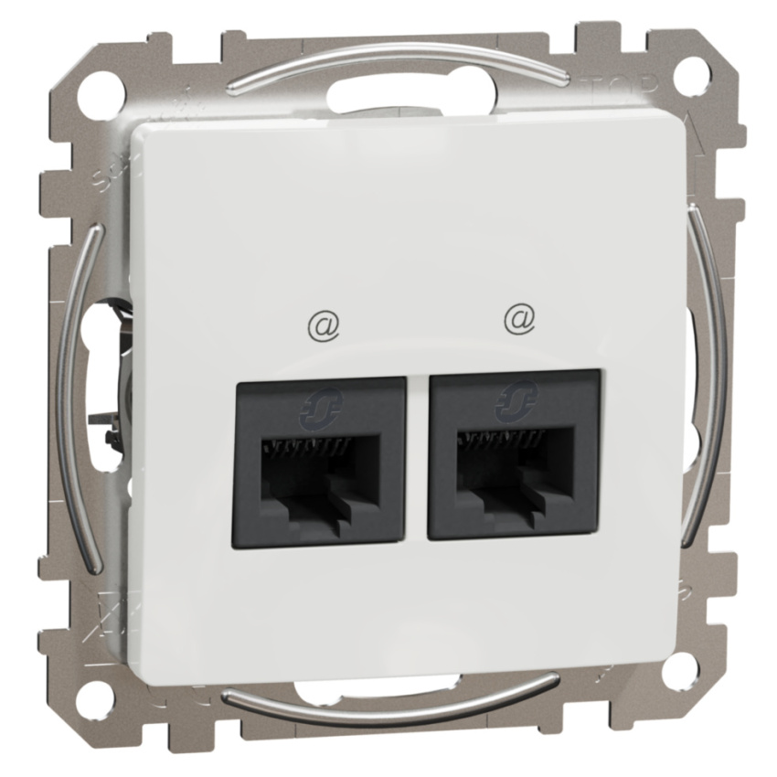 Dvojitá datová zásuvka RJ45 Kat.5e UTP, v bílé barvě.