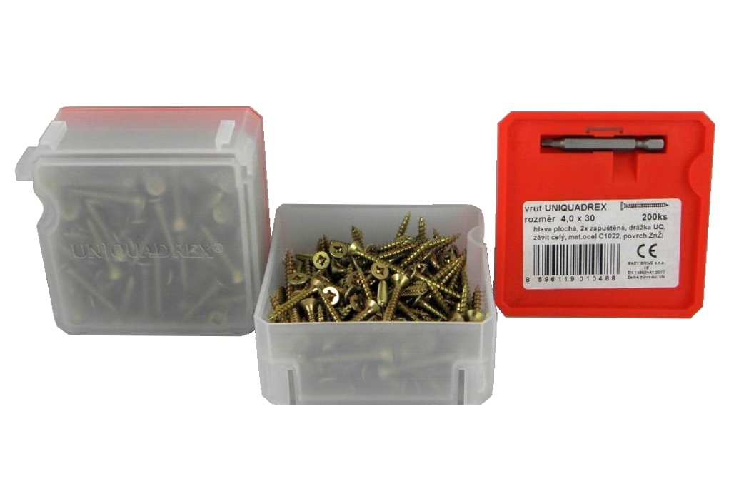 Samosvorný upevňovací systém UNIQUADREX®. Vrut je opatřen kombinovanou čtvercovou + křížovou drážkou a k ovládání při práci se používá šroubovací nástavec – bit se čtvercovým kónickým hrotem, který zaručí plné využití všech výhod tohoto systému. Systém UNIQUADREX® je schopen přenést vysoký kroutící moment. Můžete této vlastnosti využít šroubováním bez předvrtání i do velmi tvrdých materiálů. Díky konstrukci systému UNIQUADREX® dochází k minimálnímu přeskakování hrotu šroubováku v drážce vrutu a tím i k minimálnímu poškozování drážky vrutu a šroubovacího hrotu. Pokud je třeba, můžete bez problémů vrut několikanásobně zašroubovat a vyšroubovat. Díky své konstrukci a vlastnostem šetří systém UNIQUADREX® peníze za bity nebo šroubovací nástavce, protože tyto vysoce kvalitní bity SKUTEČNĚ VYDRŽÍ.