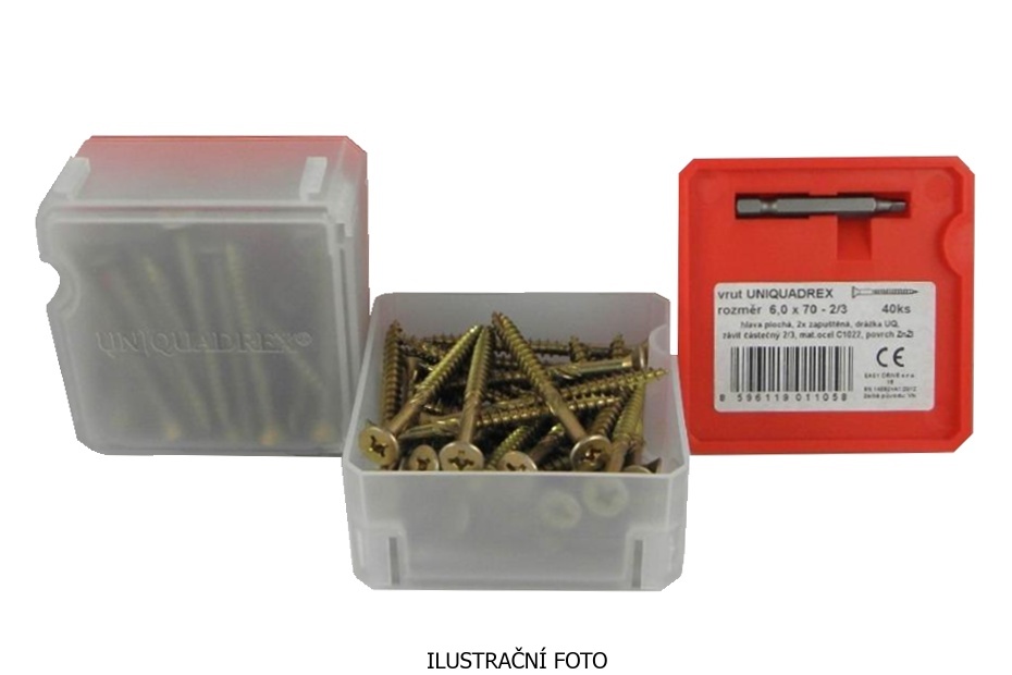 Samosvorný upevňovací systém UNIQUADREX®. Vrut je opatřen kombinovanou čtvercovou + křížovou drážkou a k ovládání při práci se používá šroubovací nástavec – bit se čtvercovým kónickým hrotem, který zaručí plné využití všech výhod tohoto systému. Systém UNIQUADREX® je schopen přenést vysoký kroutící moment. Můžete této vlastnosti využít šroubováním bez předvrtání i do velmi tvrdých materiálů. Díky konstrukci systému UNIQUADREX® dochází k minimálnímu přeskakování hrotu šroubováku v drážce vrutu a tím i k minimálnímu poškozování drážky vrutu a šroubovacího hrotu. Pokud je třeba, můžete bez problémů vrut několikanásobně zašroubovat a vyšroubovat. Díky své konstrukci a vlastnostem šetří systém UNIQUADREX® peníze za bity nebo šroubovací nástavce, protože tyto vysoce kvalitní bity SKUTEČNĚ VYDRŽÍ.