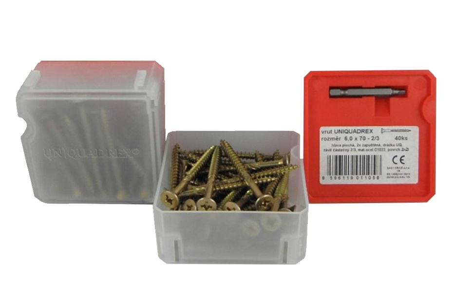 Samosvorný upevňovací systém UNIQUADREX®. Vrut je opatřen kombinovanou čtvercovou + křížovou drážkou a k ovládání při práci se používá šroubovací nástavec – bit se čtvercovým kónickým hrotem, který zaručí plné využití všech výhod tohoto systému. Systém UNIQUADREX® je schopen přenést vysoký kroutící moment. Můžete této vlastnosti využít šroubováním bez předvrtání i do velmi tvrdých materiálů. Díky konstrukci systému UNIQUADREX® dochází k minimálnímu přeskakování hrotu šroubováku v drážce vrutu a tím i k minimálnímu poškozování drážky vrutu a šroubovacího hrotu. Pokud je třeba, můžete bez problémů vrut několikanásobně zašroubovat a vyšroubovat. Díky své konstrukci a vlastnostem šetří systém UNIQUADREX® peníze za bity nebo šroubovací nástavce, protože tyto vysoce kvalitní bity SKUTEČNĚ VYDRŽÍ.