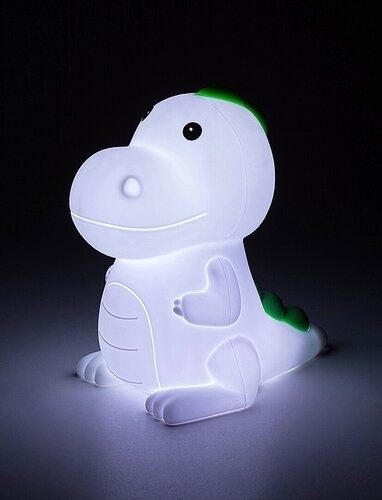 Dětská lampa Dinoo se spoustou dalších funkcí bude oblíbeným doplňkem do dětského pokoje každého chlapečka, který miluje dinosaury. Pestrobarevnou plastovou lampu s jemným dotekem doplňuje pestrobarevný silikonový obal. Noční světlo s možností RGB lze ztlumit dotykovým spínačem, takže jas lze nastavit dle potřeby. Svítilna se dobíjí pomocí USB kabelu, napětí baterie je 3,7 V a kapacita 1200 mAh. Doba nabíjení je 2,5 hodiny a provozní doba se pohybuje od 6 do 10 hodin. Dětská lampa s noční funkcí má zabudovaný LED světelný zdroj s příkonem 0,45 W, jasem 30 lumenů se stínítkem, 55 lumenů bez stínítka a s životností 10 000 hodin. Světelný zdroj má barevnou teplotu 3000 K a vyzařuje odpovídající teplé bílé světlo. Pomůže vám vytvořit v místnosti útulnou, domácí atmosféru, která je ideální pro navození nálady na spánek a relaxaci. Rozměry dekorativní lampy Dinoo jsou tyto: výška 140 mm, šířka 130 mm, délka kabelu 500 mm.