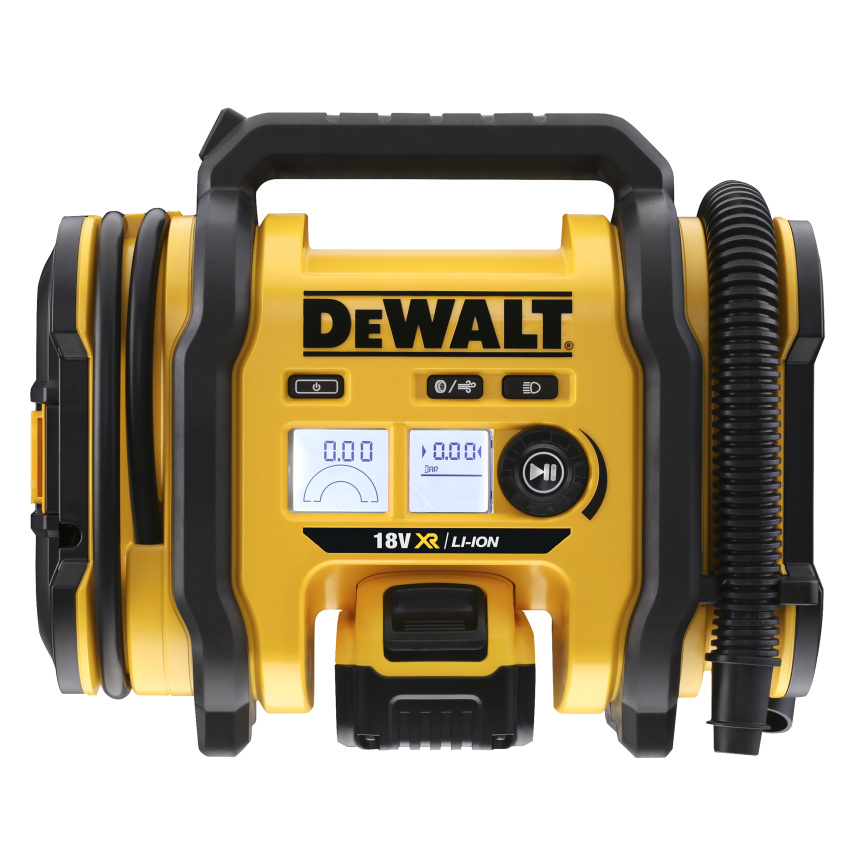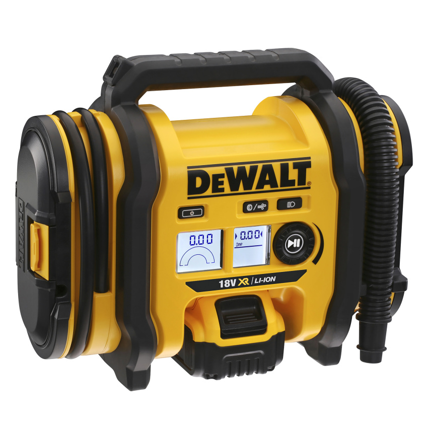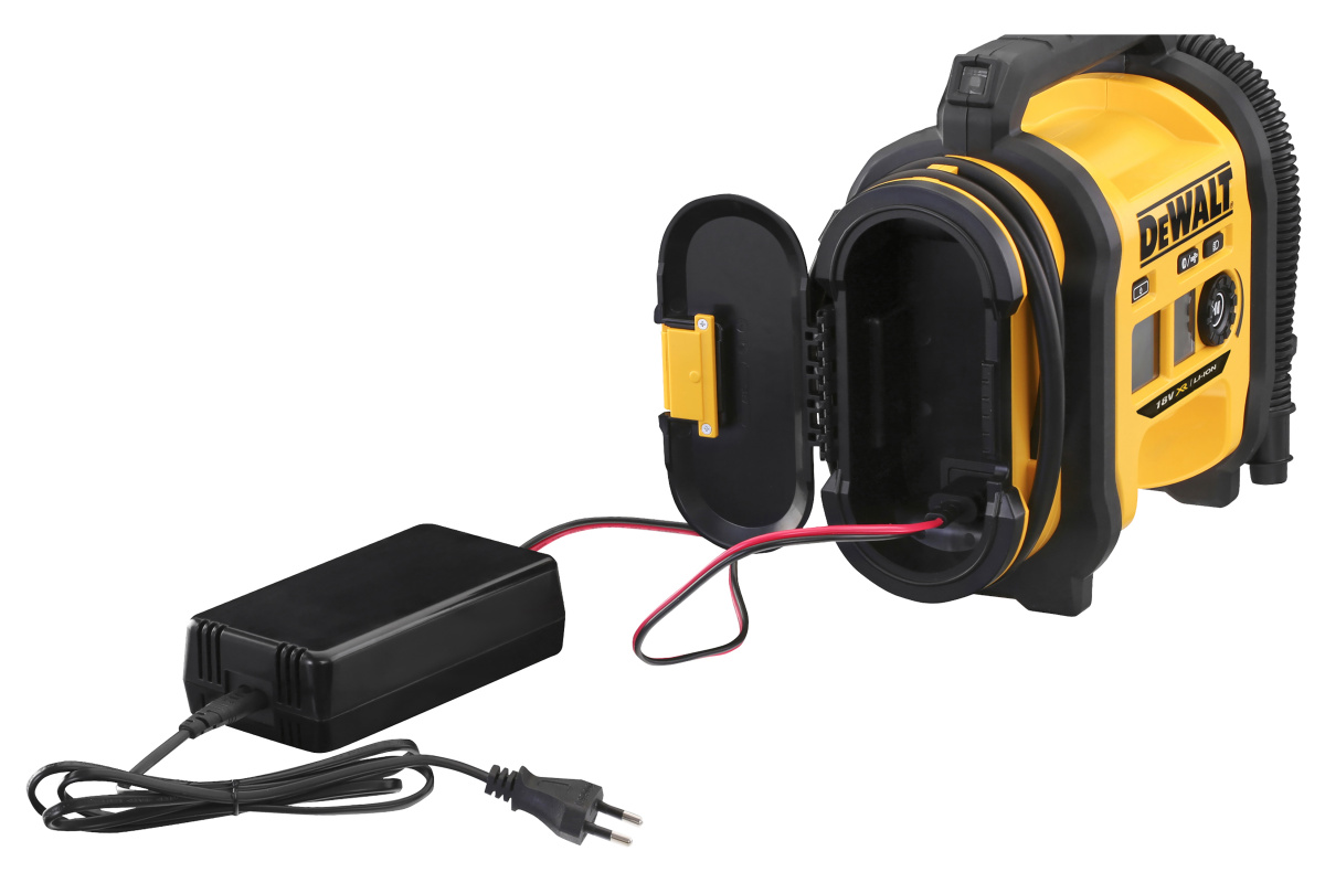 Akumulátorový přenosný kompresor DeWALT DCC018N s možností napájení 12V z autobaterie přes zapalovačovou zásuvku, nebo 18V akumulátorem DewWALT.