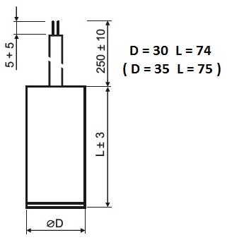 Motorový kondenzátor MPB, 10 mikroF, 30x74 mm, 450V s dvoujádrovým kabelem 250 mm, bez montáže