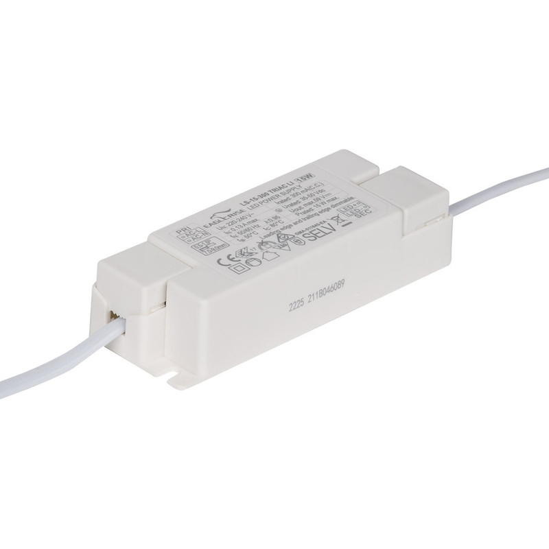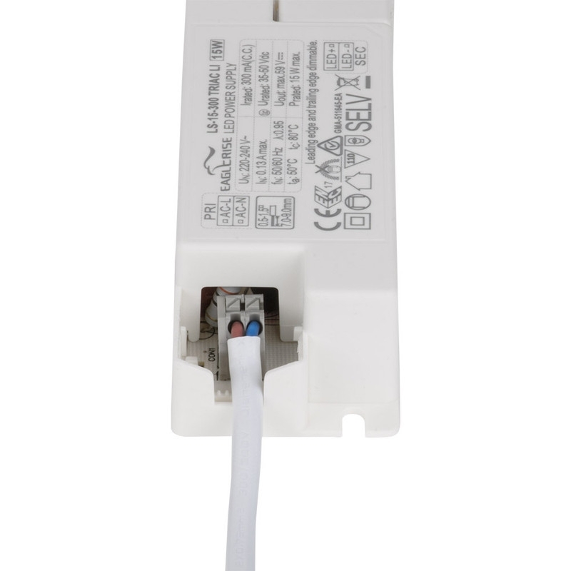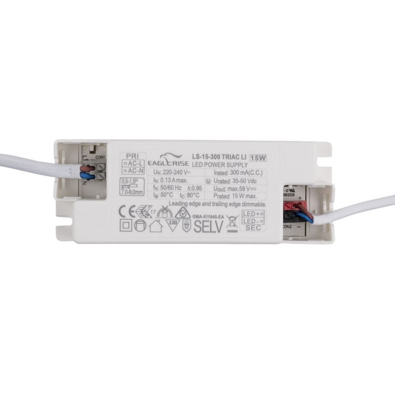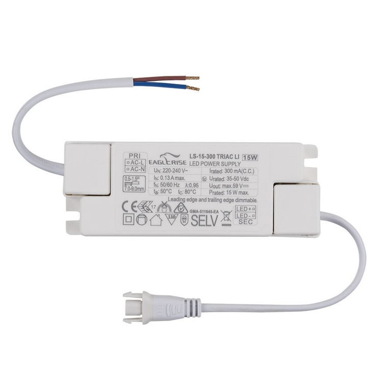Regulovatelný SELV zdroj konstantního proudu k LED svítidlům, fázově řiditelný externím stmívačem s regulací na náběžné hraně (leading edge LE) nebo sestupné hraně (trailing edge TE). Maximální výkon 15W, PF min 0,9, vstupní napětí AC 220-240V 50/60Hz, výstupní napětí DC 35-50V, výstupní proud 300mA. Rozměry 116x42,5x28mm, IP20, materiál plast. Zdroj disponuje integrovanou ochranou proti zkratu, přetížení i přehřátí.