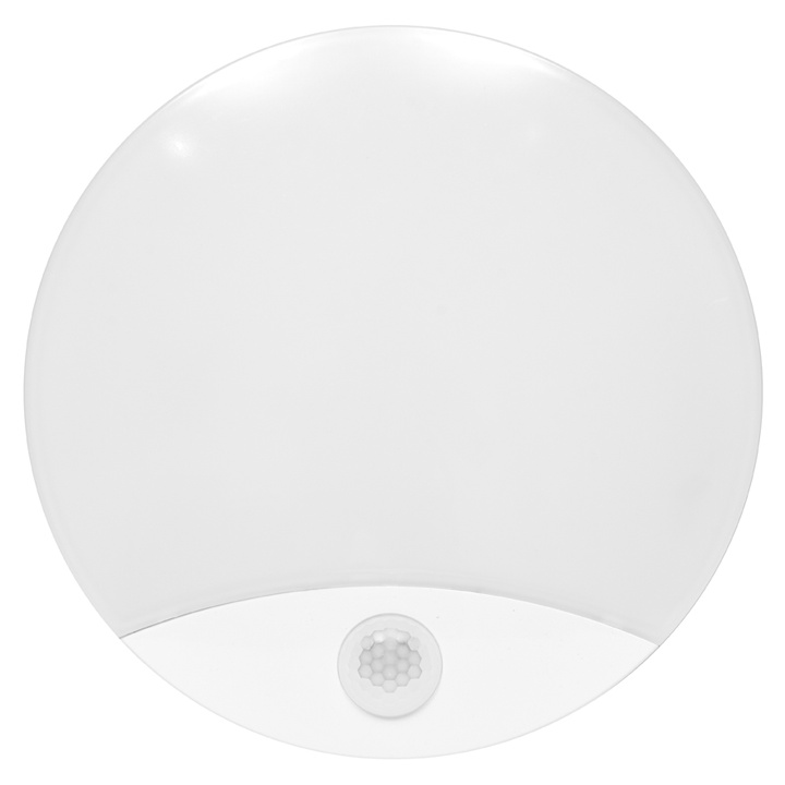Rozměry - ? 25 x 5cm# Vstupní napětí [V] - 220-240# Max. výkon [W] - 15W# Barva světla - bílá# Teplota chromatičnosti [K] - 4100# Pohybový senzor - ano (PIR)# Dosah / úhel pokrytí - 9m / 160°# Doba sepnutí - 10s-12min# Citlivost - 3-2000 lx# Materiál - polykarbonát# Barva produktu - bílá# Stupeň krytí IP - 44# Třída ochrany - II# Typ zdroje - LED SMD#