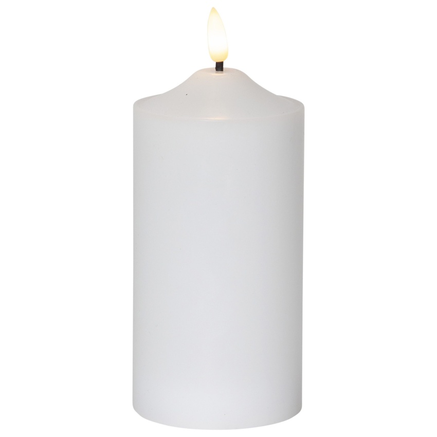 Vosková svíčka s plamenem vypadajícím v přírodě, který se rozsvítí v teplé bílé barvě. Svíčka má vestavěný časovač. Výška včetně plamene je 17 cm.