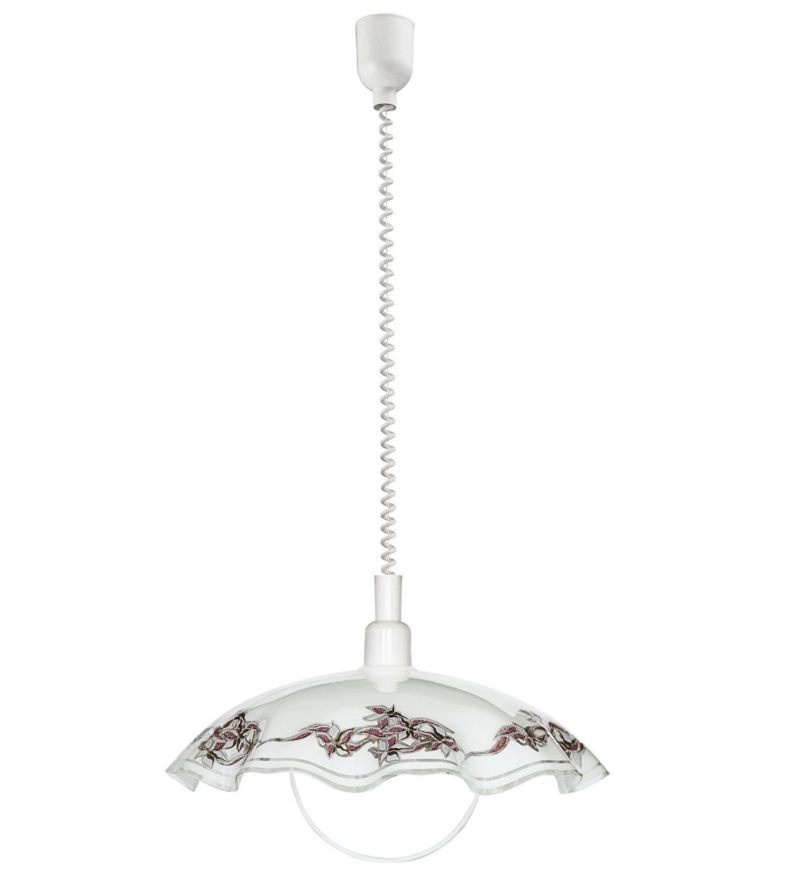 Závěsné svítidlo VETRO má kulaté stínidlo ze saténového skla v bílé barvě se zakřiveným okrajem a bílý plastový vrchlík. Stínidlo má květinový vzor ve fialové a černé barvě, který krásně doplňuje hravý design. Výška je nastavitelná díky spirálovému kabelu a kovovému držáku na stínítku. Závěsné svítidlo hladce zapadne do tradičních interiérů ve stylu chaty a poskytne poutavé osvětlení v kuchyni nebo nad stolem v jídelně. Žárovka není součástí dodávky. Výrobek má objímku žárovky E27 a vyžaduje žárovku E27.
