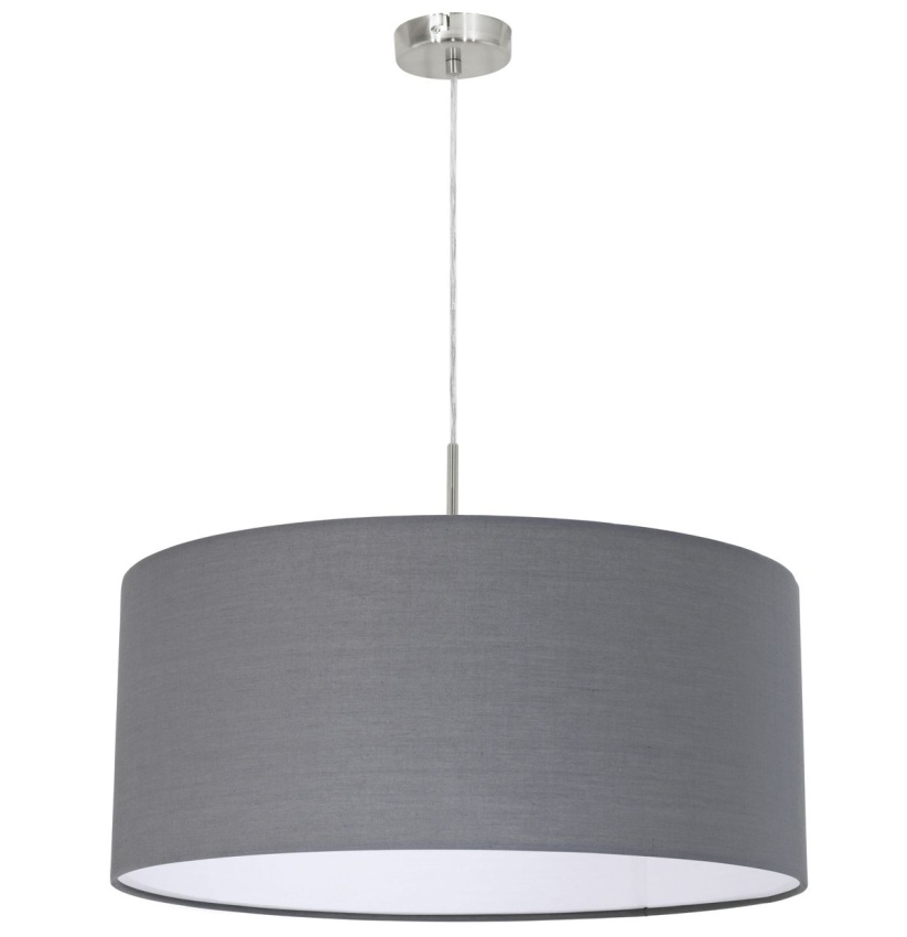Toto závěsné svítidlo ze série PASTERI je vyrobeno ze saténově niklové oceli a látky v šedé barvě. Bodové světlo potřebuje žárovku E27.