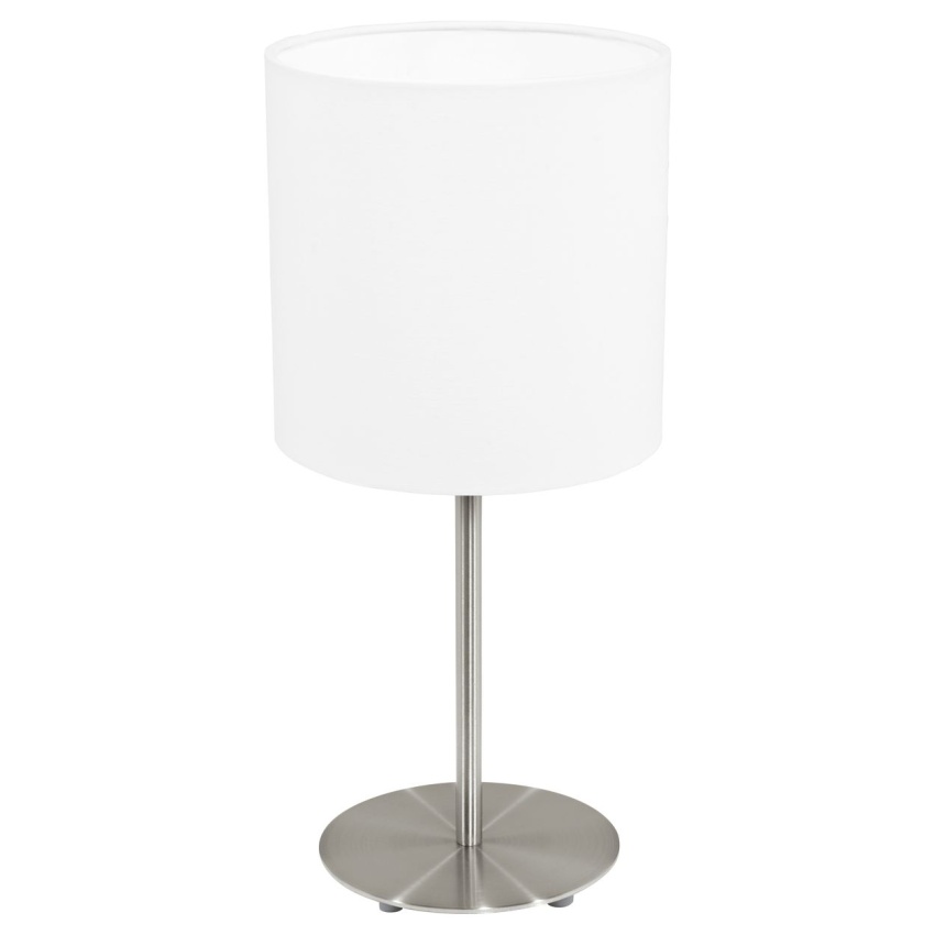 Toto stolní svítidlo ze série PASTERI je vyrobeno ze saténově niklové oceli a látky v bílé barvě. Ovládá se kabelovým vypínačem, má ochrannou izolaci a ke svítení potřebuje žárovku E27.