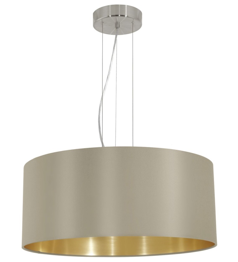 Toto závěsné svítidlo ze série MASERLO je vyrobeno ze saténově niklové oceli a tkaniny v barvách taupe a zlatá. Má ochrannou izolaci a potřebuje tři žárovky E27, aby svítila.