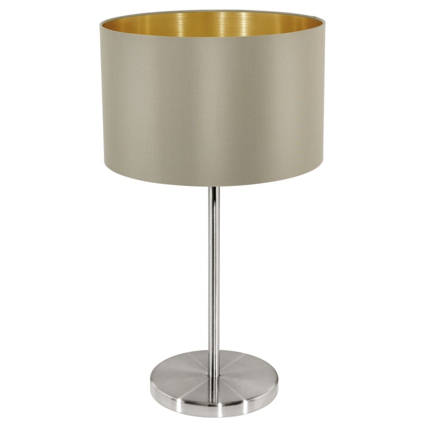 Toto stolní svítidlo ze série MASERLO je vyrobeno ze saténově niklové oceli a tkaniny v barvách taupe a gold a ovládá se kabelovým vypínačem. Má ochrannou izolaci a pro svítivost potřebuje žárovku E27.