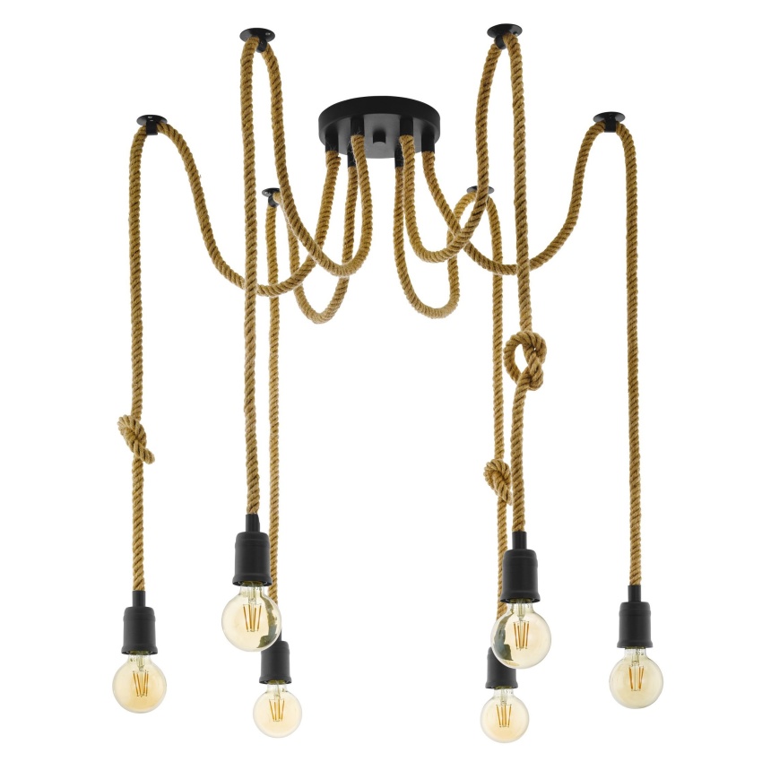 Závěsné svítidlo RAMPSIDE má šest černých držáků lamp, každý zavěšený na konopném laně. Výška a poloha jednotlivých závěsů jsou nastavitelné pomocí přídavných stropních držáků, přičemž délka každého držáku lampy se nastavuje jednoduše zauzlováním provazu. Závěsné svítidlo má působivou směs přírodních materiálů, které hladce ladí s vintage trendem. Poskytuje moderní osvětlení jakéhokoli prostoru, ať už v obývacím pokoji nebo nad stolem v jídelně. Vyobrazené žárovky s vláknem nejsou součástí dodávky. Výrobek má objímky žárovek E27 a vyžaduje žárovky E27.
