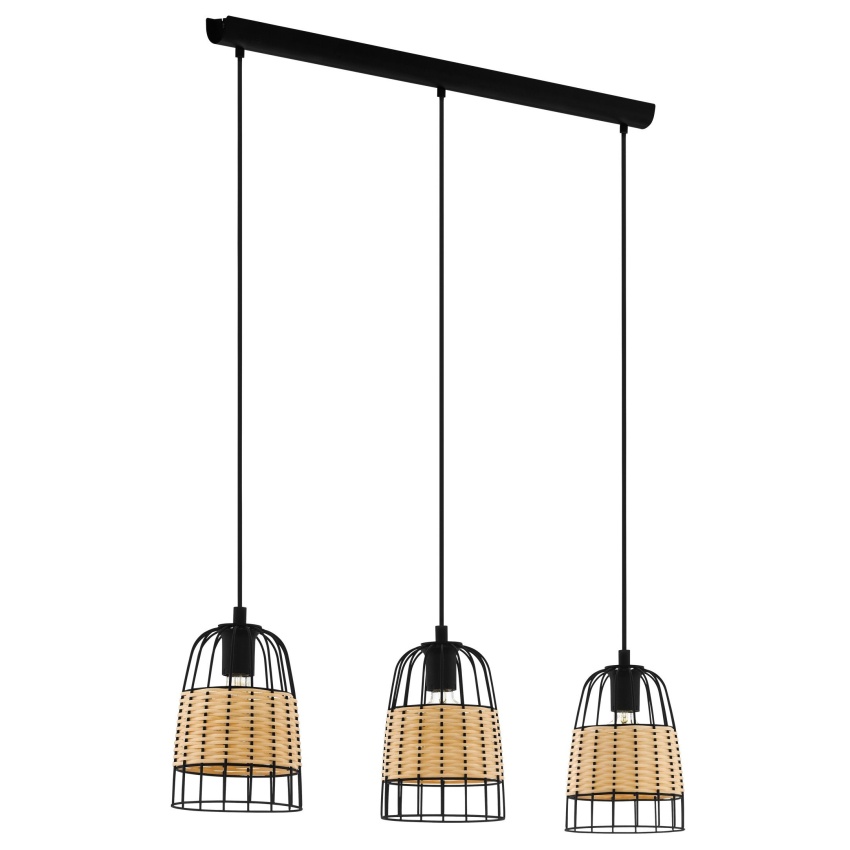 Závěsné svítidlo ANWICK je vyrobeno z kovu a má tři stínidla s černými kovovými rámy spárovanými s pásy z přírodního ratanu. Stínidla vytvářejí fascinující hru světla a stínu, jakmile se rozsvítí světlo. Závěsné svítidlo hladce splyne s trendy jako vintage a boho, produkt poskytuje stylové osvětlení v kuchyni nebo obývacím pokoji nebo nad dlouhým stolem v jídelně. Vyobrazené žárovky nejsou součástí dodávky. Výrobek má objímky žárovek E27 a vyžaduje 3 žárovky E27.