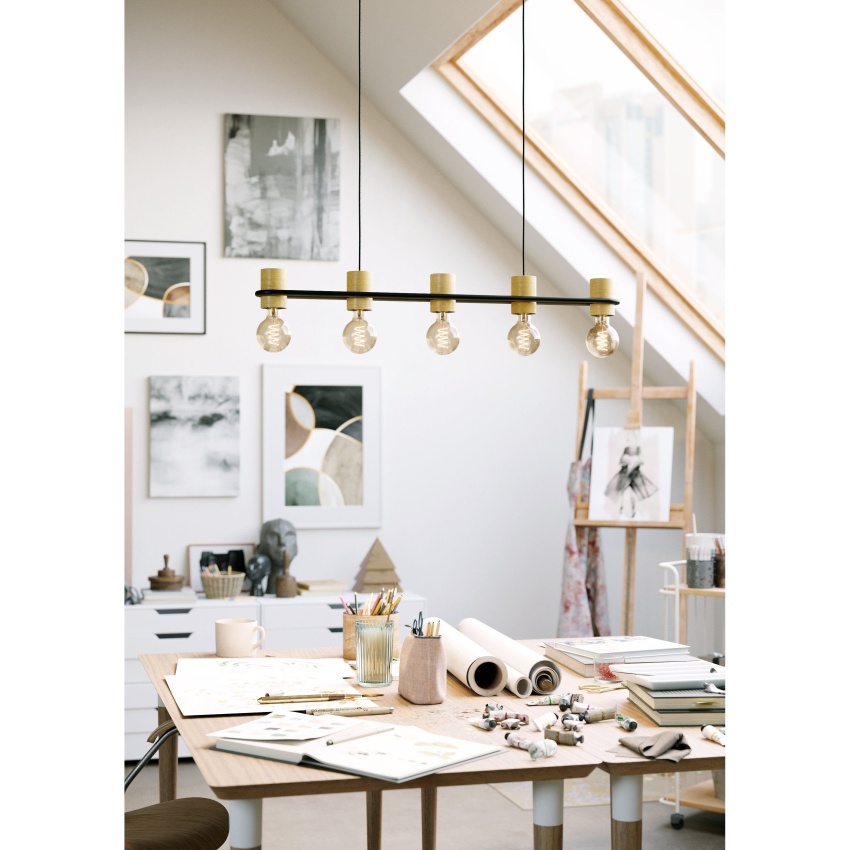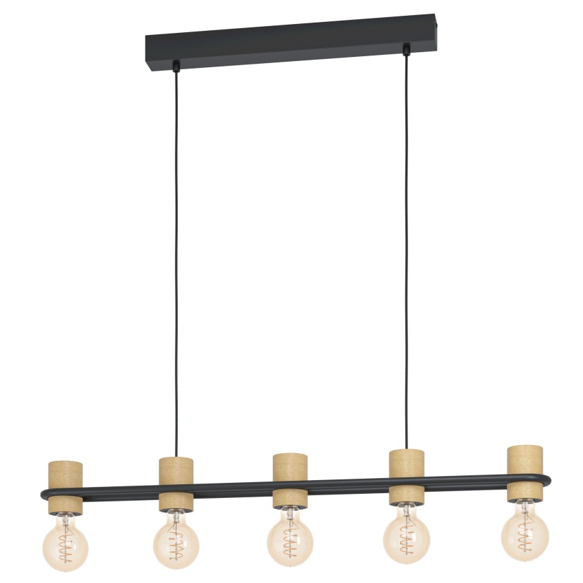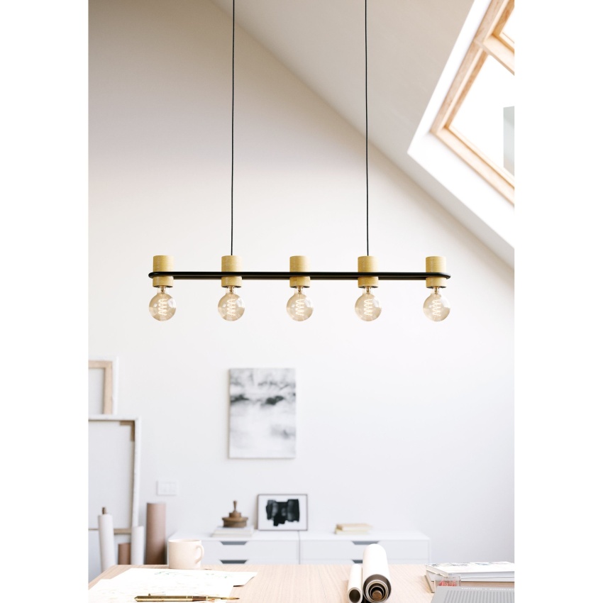 Závěsné svítidlo CHIEVELEY se vyznačuje elipsovitým černým kovovým kroužkem obklopujícím pět vertikálních držáků lamp vyrobených z přírodního kaučukovníku. Díky tomuto přirozenému designu se produkt dokonale snoubí s minimalistickými styly interiéru. Tato módní kombinace dřeva a kovu vytváří výrazné osvětlení ve vašich obytných prostorech. Výrobek vyžaduje 5 žárovek E27, které nejsou součástí balení