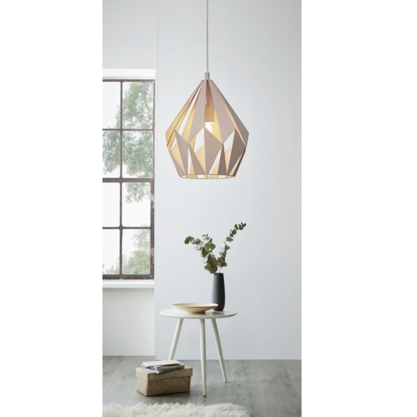 Závěsné svítidlo CARLTON-P má pastelové kovové stínidlo ve tvaru diamantu v meruňkové barvě s bílým textilním kabelem. Když svítí závěsné světlo, vytváří tento produkt fascinující hru světla a stínu prostřednictvím geometrických otvorů na kovovém stínítku. Závěsné svítidlo meruňkové barvy doplní moderní interiéry a dobře se uplatní v každém prostoru, ať už v obývacím pokoji nebo nad stolem v jídelně. Výrobek vyžaduje 1 žárovku E27, která není součástí balení.