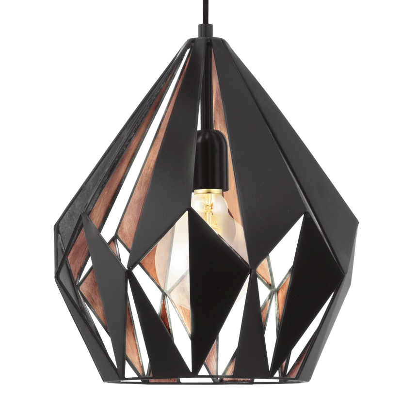 Závěsné svítidlo CARLTON 1 se vyznačuje černým kovovým stínidlem ve tvaru diamantu s vnitřní měděnou podšívkou. Geometrické otvory na kovovém těle vytvářejí na stěně fascinující hru světla a stínu. Závěsné svítidlo doplní moderní interiéry ve vintage stylu a dobře se hodí do každého prostoru, ať už v obývacím pokoji nebo nad stolem v jídelně. Výrobek vyžaduje 1 žárovku E27, která není součástí balení.