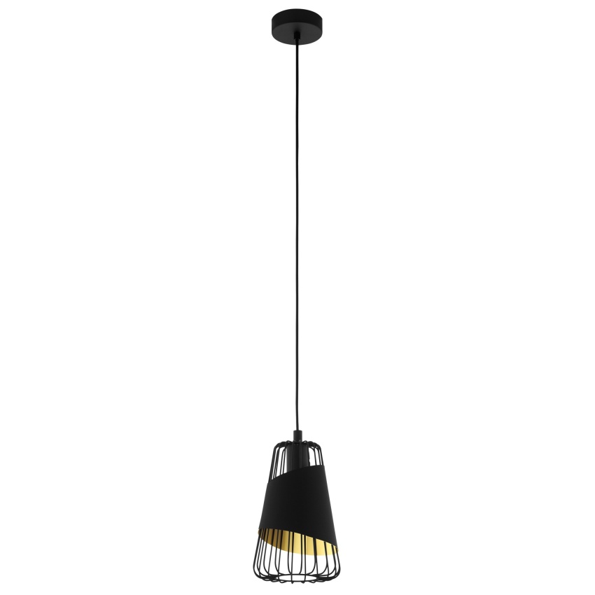 Závěsné svítidlo AUSTELL je vyrobeno z černého kovu a má stínidlo s černým drátěným rámem. Kolem tohoto rámu je omotaný černý pruh látky se zlatým vnitřním povrchem. Stínidlo vytváří na stěně fascinující hru světla a stínu. Design plynule zapadá do moderních interiérů a poskytuje dokonalou náladu v každém prostoru, ať už v obývacím pokoji nebo nad stolem v jídelně. Žárovka není součástí dodávky. Výrobek má objímku žárovky E27 a vyžaduje žárovku E27.