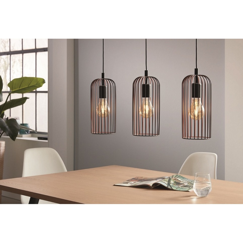Závěsné svítidlo ROCCAMENA se vyznačuje třemi drátěnými stínidly s kontrastní černou a měděnou povrchovou úpravou, která vytváří výrazný vzhled. Závěsné svítidlo má podlouhlý černý kovový vrchlík. Stínidla vytvářejí při rozsvíceném světle fascinující hru světla a stínu. Design doplňuje moderní interiéry a vytváří oslnivé osvětlení v každém prostoru, ať už v obývacím pokoji nebo nad stolem v jídelně. Vyobrazené žárovky s vláknem nejsou součástí dodávky. Výrobek má objímky žárovek E27 a vyžaduje žárovky E27.