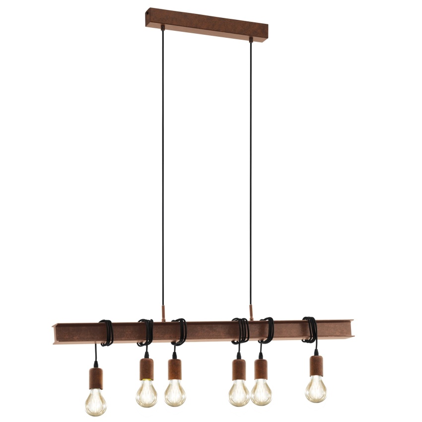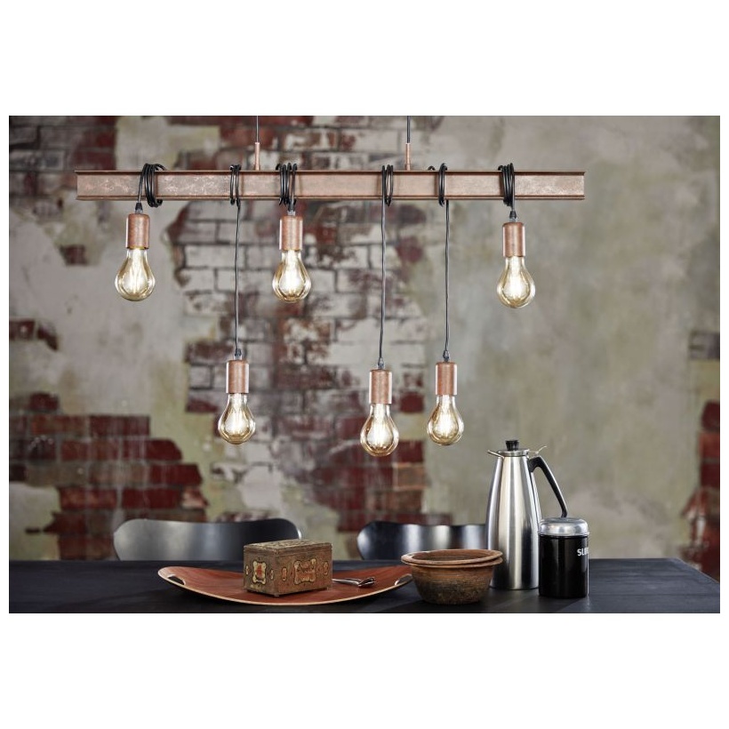 Závěsné svítidlo TOWNSHEND 4 se vyznačuje rezavě hnědým kovovým nosníkem připomínajícím ocelový nosník. Kovová lišta má šest rezavohnědých držáků lamp zavěšených v různých výškách a lze je měnit navíjením nebo odvíjením kabelů. Závěsné svítidlo hladce splyne s trendy, jako je vintage a industrial. Ať už v obývacím pokoji nebo nad dlouhým stolem v jídelně, produkt vytváří výrazný, poutavý prvek v každém prostoru. Vyobrazené žárovky s vláknem nejsou součástí dodávky. Výrobek má objímky žárovek E27 a vyžaduje žárovky E27.