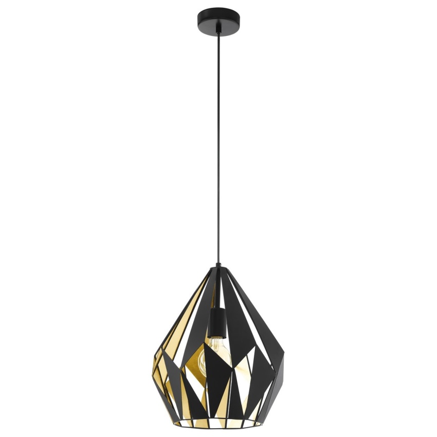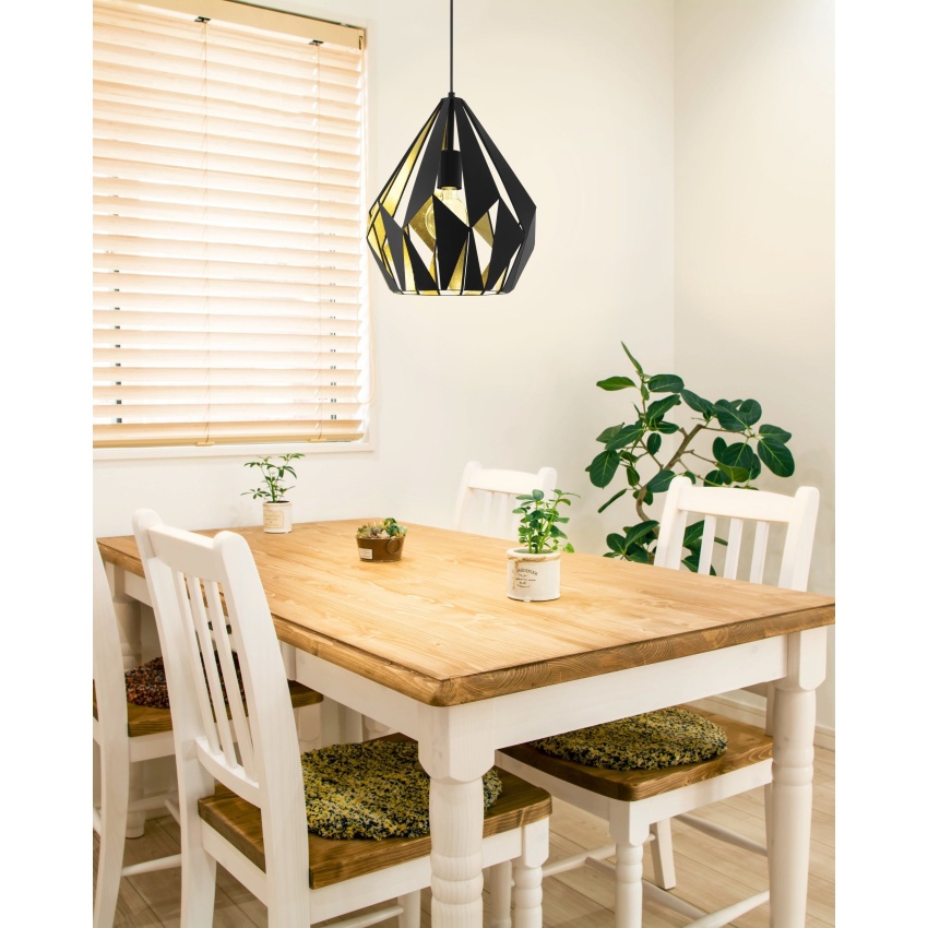 Závěsné svítidlo CARLTON 1 má černé kovové stínidlo ve tvaru diamantu s vnitřním zlatým obložením. Geometrické otvory na kovovém těle vytvářejí na stěně fascinující hru světla a stínu. Závěsné svítidlo doplní moderní interiéry ve vintage stylu a dobře se hodí do každého prostoru, ať už v obývacím pokoji nebo nad stolem v jídelně. Výrobek vyžaduje 1 žárovku E27, která není součástí balení.
