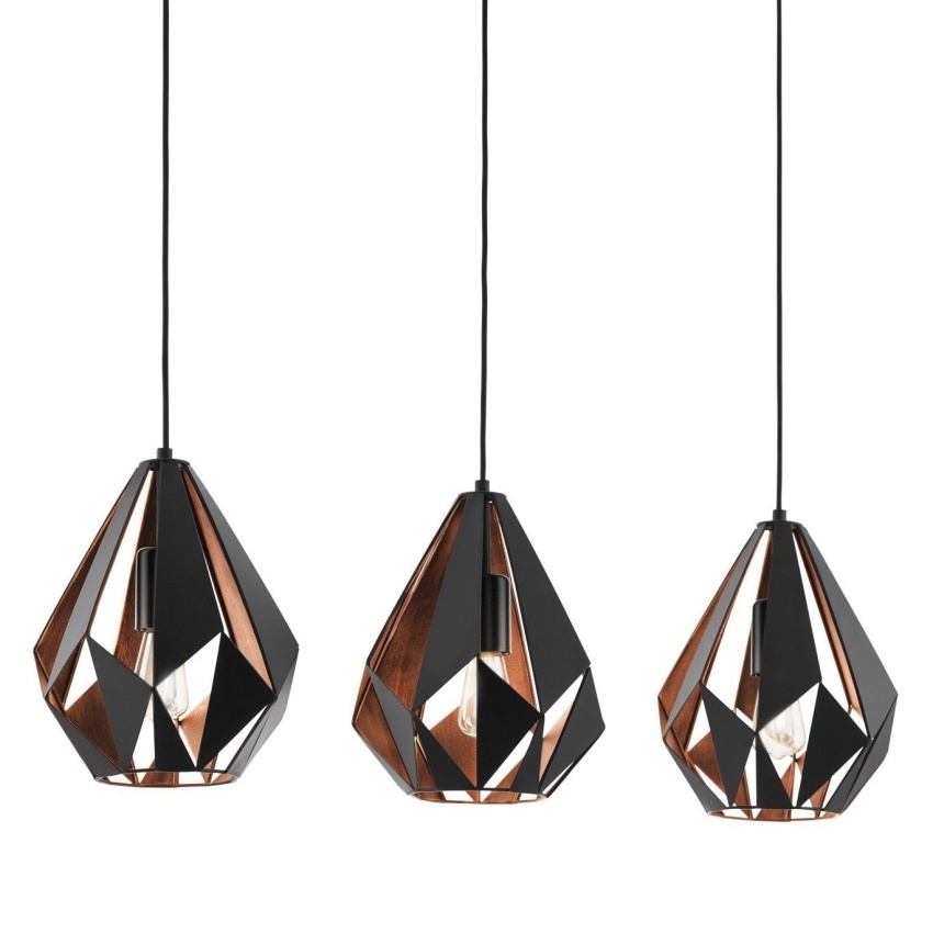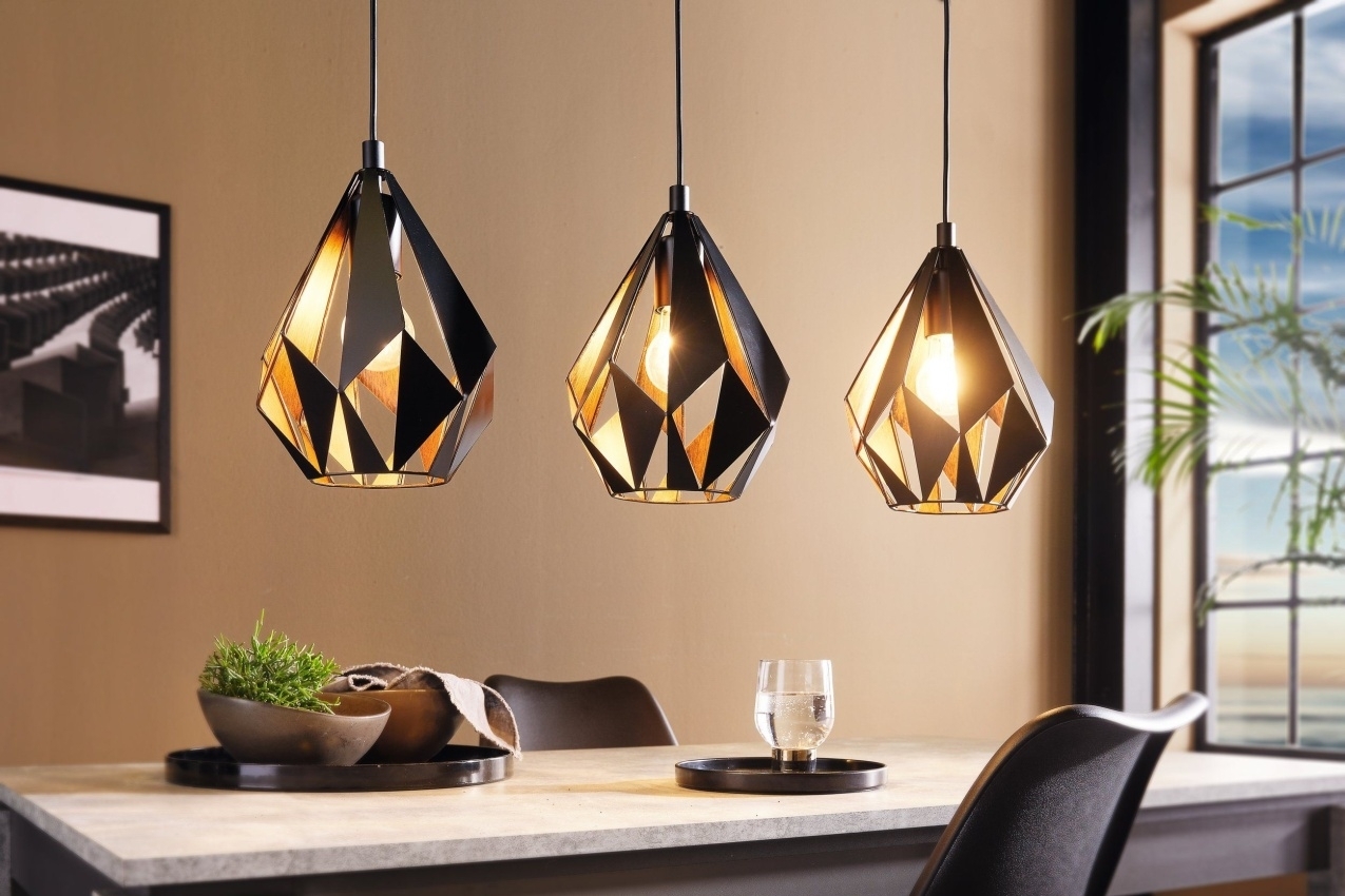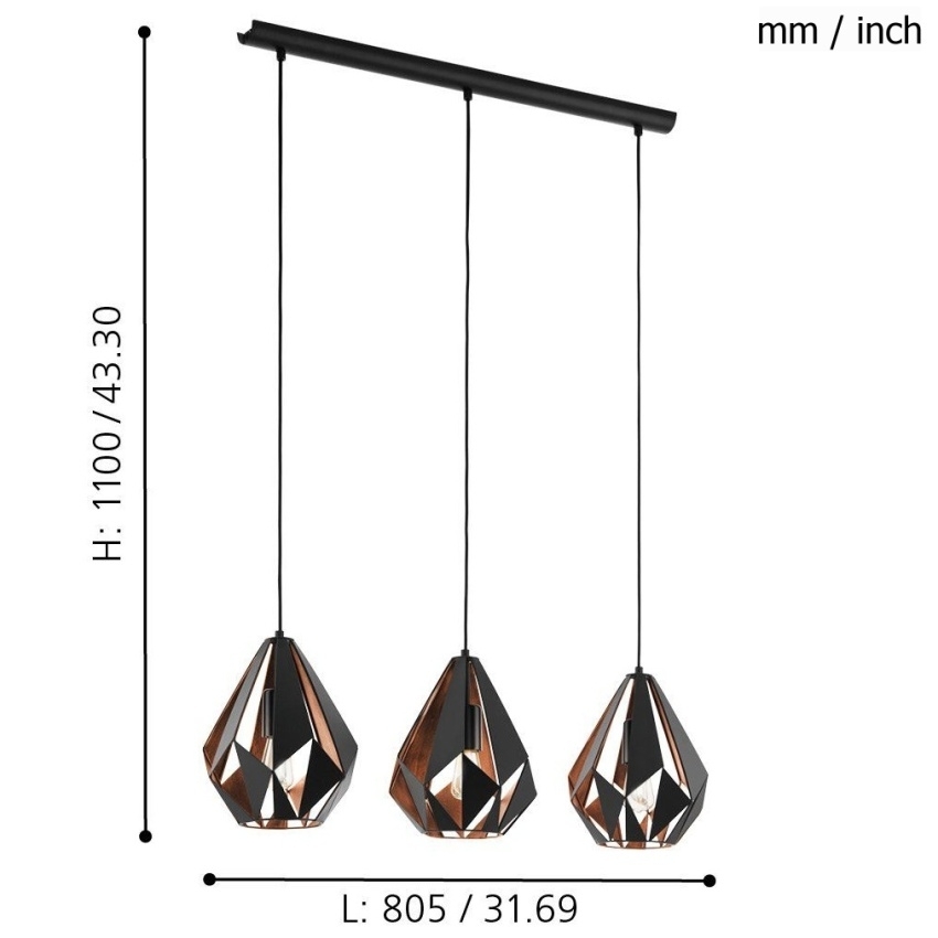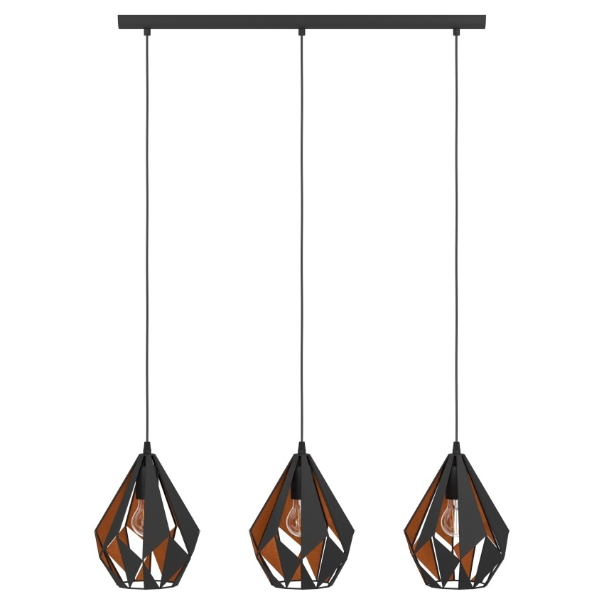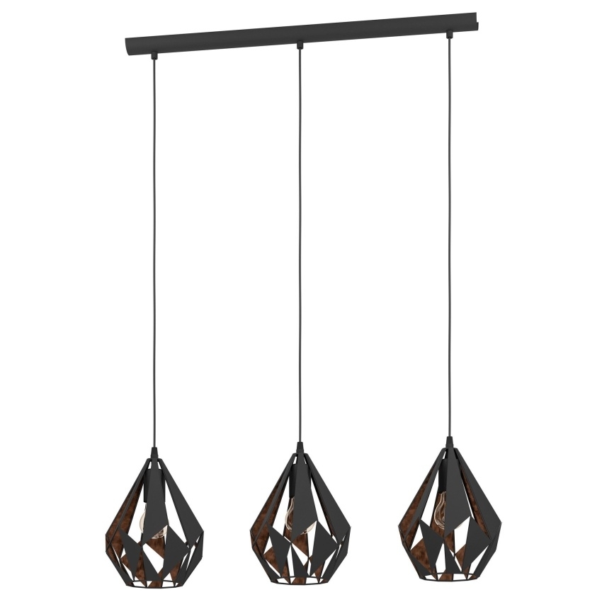 Závěsné svítidlo CARLTON 1 se vyznačuje třemi černými kovovými stínidly ve tvaru diamantu s vnitřním měděným obložením. Geometrické otvory na kovových tělech vytvářejí na stěně fascinující hru světla a stínu. Závěsné svítidlo doplní moderní interiéry ve vintage stylu a dobře se hodí do každého prostoru, ať už v obývacím pokoji nebo nad dlouhým stolem v jídelně. Výrobek vyžaduje 3 x E27 žárovky, které nejsou součástí balení.