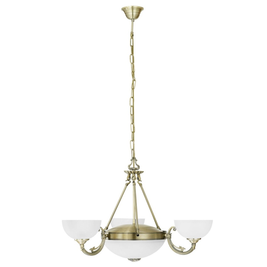 Toto závěsné svítidlo ze série SAVOY je vyrobeno z bronzovaného litého kovu a bílého satinovaného skla. Bodové světlo potřebuje tři žárovky E14 a dvě žárovky E27.