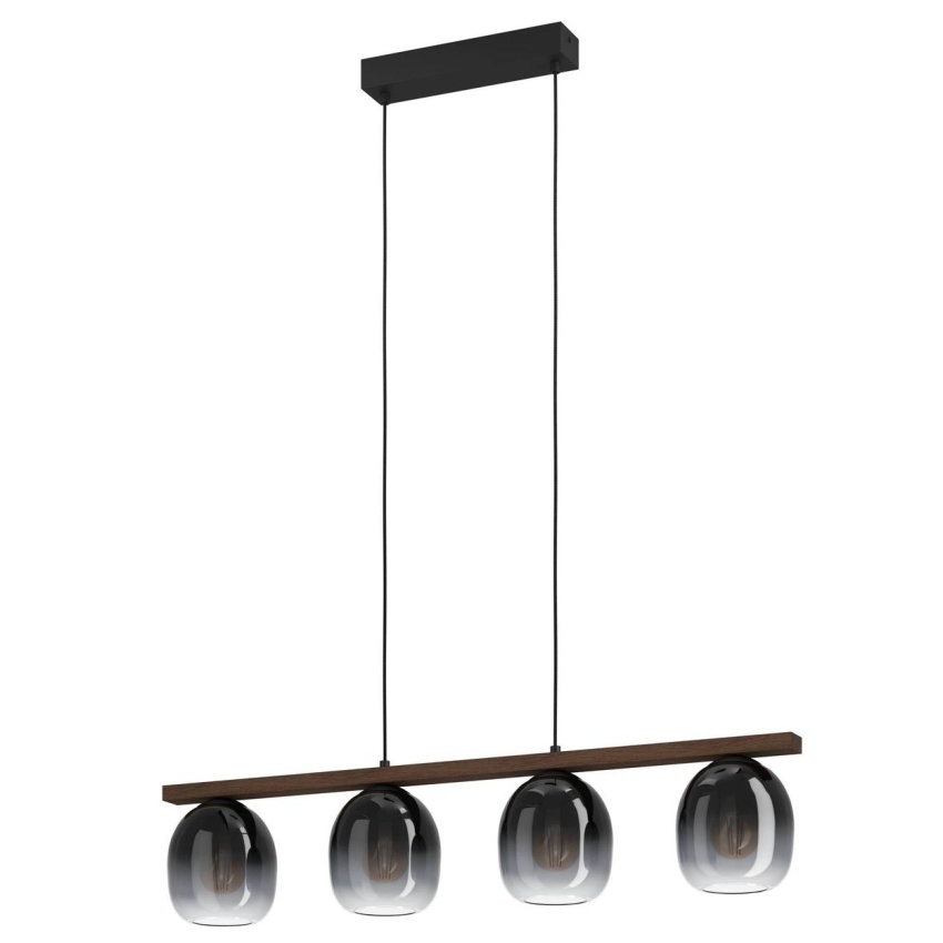 Závěsné svítidlo FILAGO se vyznačuje paprskem z borovicového dřeva v ořechově hnědém provedení v kombinaci se čtyřmi kulatými skleněnými stínidly, která přecházejí z černé do průhledné. Elegantní vzhled svítidla doplňuje stropní držák s černými textilními kabely zavěšenými na černém kovovém krytu. Výrobek se dokonale hodí do moderních interiérů a poskytuje příjemné osvětlení v každém prostoru, ať už v obývacím pokoji nebo nad dlouhým stolem v jídelně. Žárovky nejsou součástí dodávky. Výrobek má objímky žárovek E27 a vyžaduje žárovky E27.