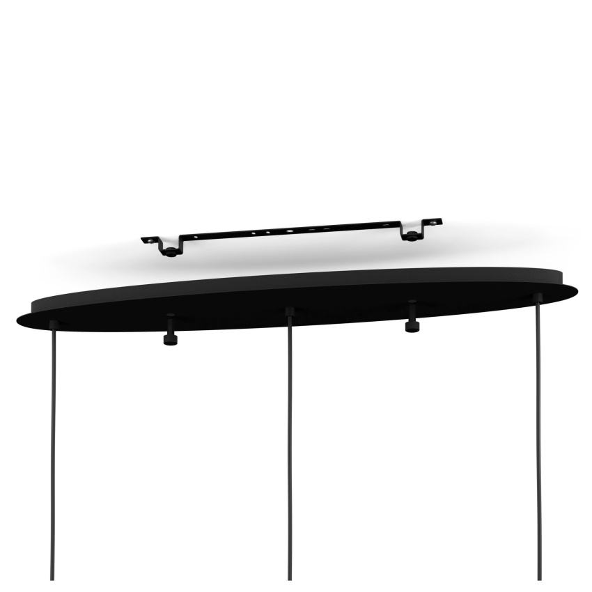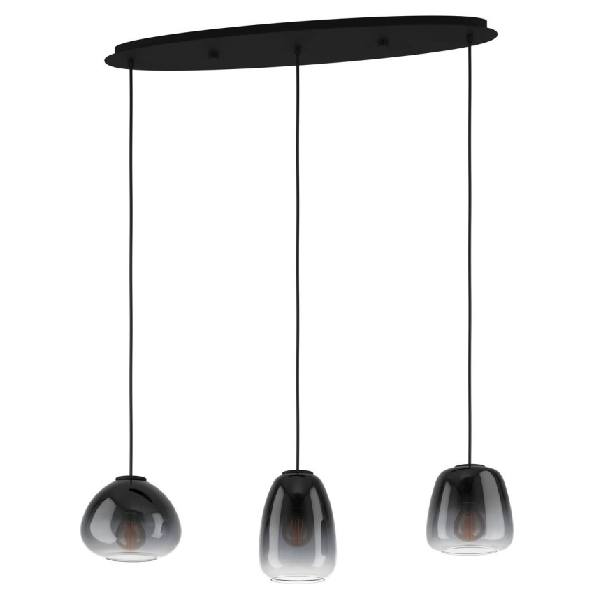 Závěsné svítidlo AGUILARES obsahuje tři jemně zakřivená, zavěšená skleněná stínidla, každé s jiným designem a barevným přechodem, který přechází z černé do průhledné. Stínidla jsou zavěšena na černých textilních kabelech z oválného vrchlíku z černého kovu, který krásně doplňuje elegantní vzhled svítidla. Závěsné svítidlo hladce splyne s moderními styly a vytvoří výrazné osvětlení v obývacím pokoji nebo nad stolem v jídelně. Vyobrazené žárovky s vláknem nejsou součástí dodávky. Výrobek má objímky žárovek E27 a vyžaduje 3 žárovky E27.