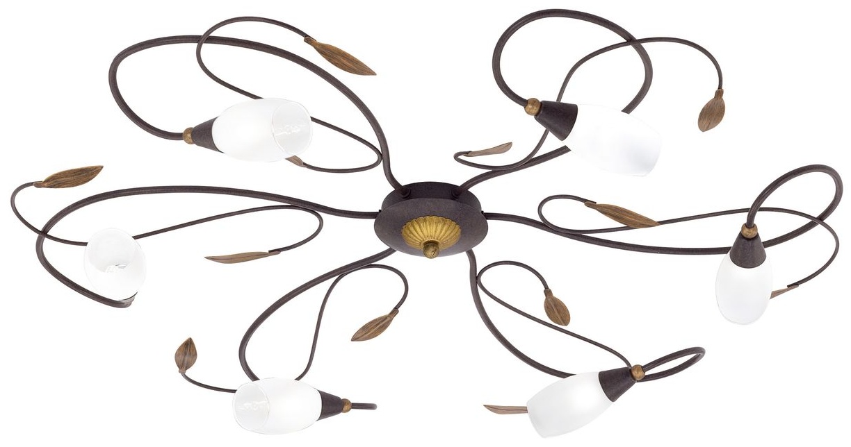 Toto stropní svítidlo ze série GERBERA 1 je vyrobeno ze starohnědé a zlaté oceli a bílého satinovaného skla. Je vybaven šesti halogenovými žárovkami G9.