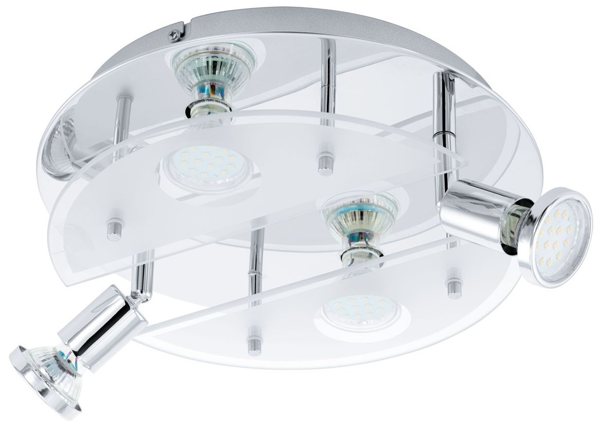 Toto stropní svítidlo ze série CABO je vyrobeno z chromované oceli a čirého a bílého satinovaného skla. Je vybavena čtyřmi žárovkami GU10-LED pro teplé bílé světlo.