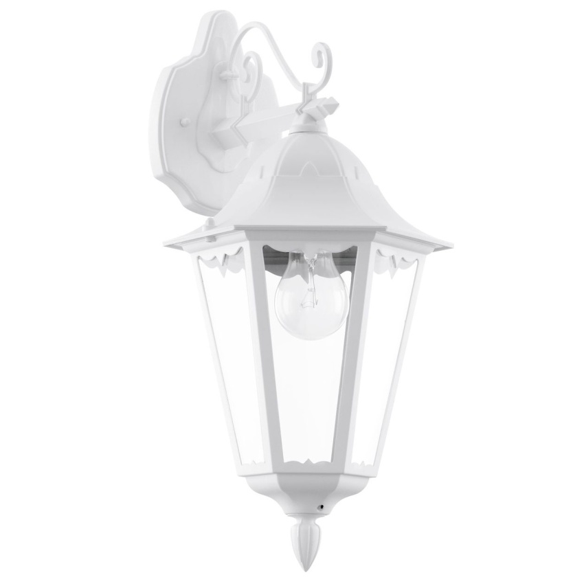 Venkovní nástěnné (závěsné) svítidlo NAVEDO ve stylu lucerny má tělo z litého hliníku v bílé barvě s čirými skleněnými tabulemi. Exteriérové svítidlo je vhodné pro venkovní použití díky krytí IP44 proti stříkající vodě. Výrobek má klasický design a hodí se do venkovních prostor, jako jsou městské vily v tradičním stylu nebo secesní – ideální nástěnné svítidlo na terasy nebo balkony. Vyobrazená žárovka není součástí balení. Výrobek má objímku žárovky E27 a vyžaduje žárovku E27.