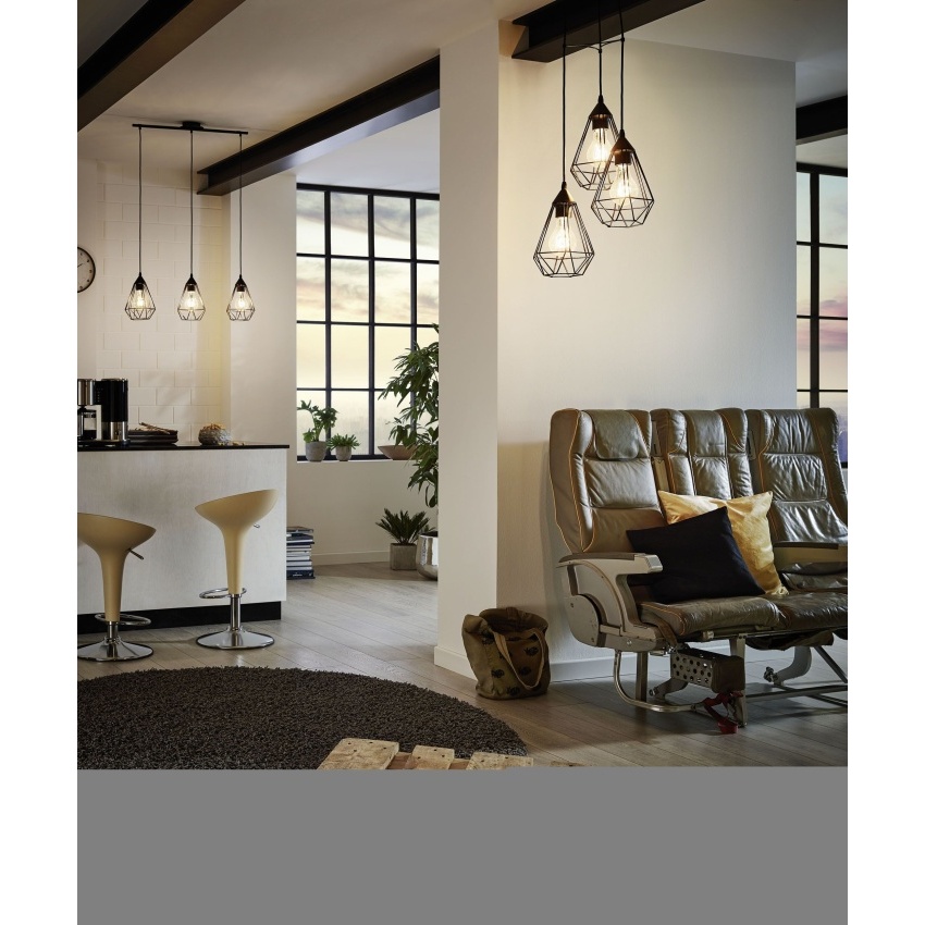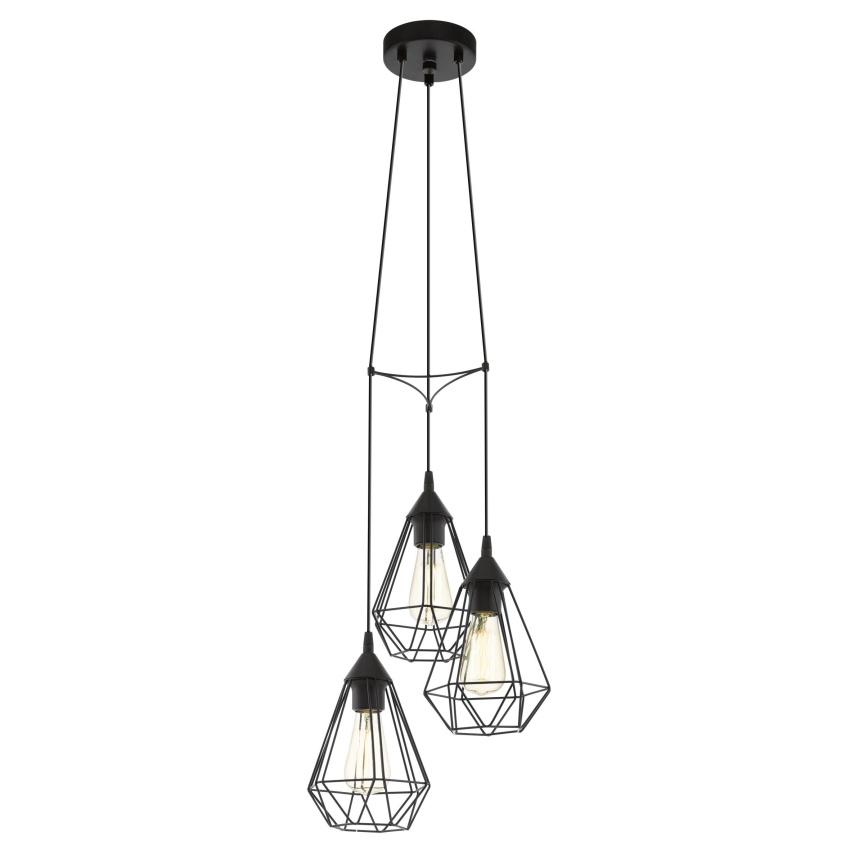 Závěsné svítidlo TARBES má tři černá drátěná stínidla v jemném kosočtverečném tvaru zavěšená v různých výškách na kulatém baldachýnu stejné barvy. Když je světlo zapnuté, vytváří fascinující hru světla a stínu prostřednictvím geometrického designu. Ať už v obývacím pokoji nebo nad jídelním stolem, moderní závěsné svítidlo poskytuje stylové osvětlení jakéhokoli prostoru. Vyobrazené žárovky s vláknem nejsou součástí dodávky. Výrobek má objímky žárovek E27 a vyžaduje žárovky E27.