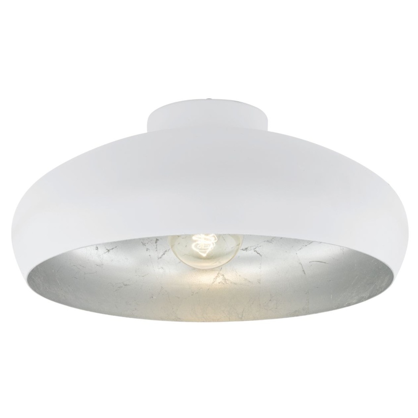 Stropní svítidlo MOGANO má kulaté bílé kovové stínidlo se stříbrným vnitřním povrchem. Stropní svítidlo hladce zapadne do moderních interiérů a nabízí minimalistické řešení osvětlení pro jakýkoli prostor, ať už v kuchyni, obývacím pokoji, ložnici nebo chodbě. Vyobrazená žárovka s vláknem není součástí balení. Výrobek má objímku žárovky E27 a vyžaduje žárovku E27.