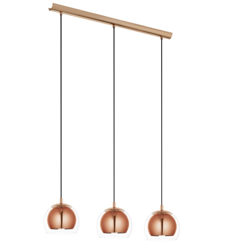 Závěsné svítidlo ROCAMAR má tři kulová stínidla z čirého skla, z nichž každé obklopuje vnitřní kovový válec v měděné úpravě. Design má obdélníkový kovový kryt měděné barvy. Elegantní závěsné svítidlo má jednoduchý design a skvěle doplňuje moderní interiéry a poskytuje stylové osvětlení v obývacím pokoji nebo jídelně nad jídelním stolem. Žárovky nejsou součástí dodávky. Výrobek má objímky žárovek E27 a vyžaduje žárovky E27.