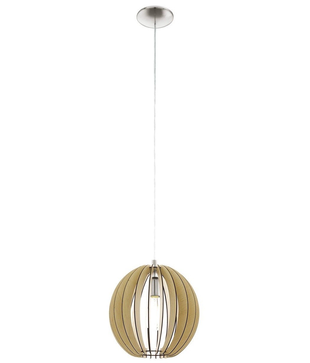 Závěsné svítidlo COSSANO má kulaté stínidlo vyrobené z dřevěných lamel v barvě javoru zavěšených na vrchlíku z matného niklu. Dřevěné lamely vytvářejí při rozsvíceném světle fascinující hru světla a stínu. Závěsné svítidlo s průměrem 30 cm hladce splyne s moderními styly interiérového designu a poskytuje příjemné osvětlení v obývacím pokoji nebo nad jídelním stolem. Žárovka není součástí dodávky. Výrobek má objímku žárovky E27 a vyžaduje 1 žárovku E27.