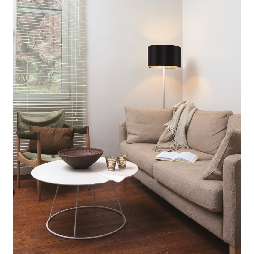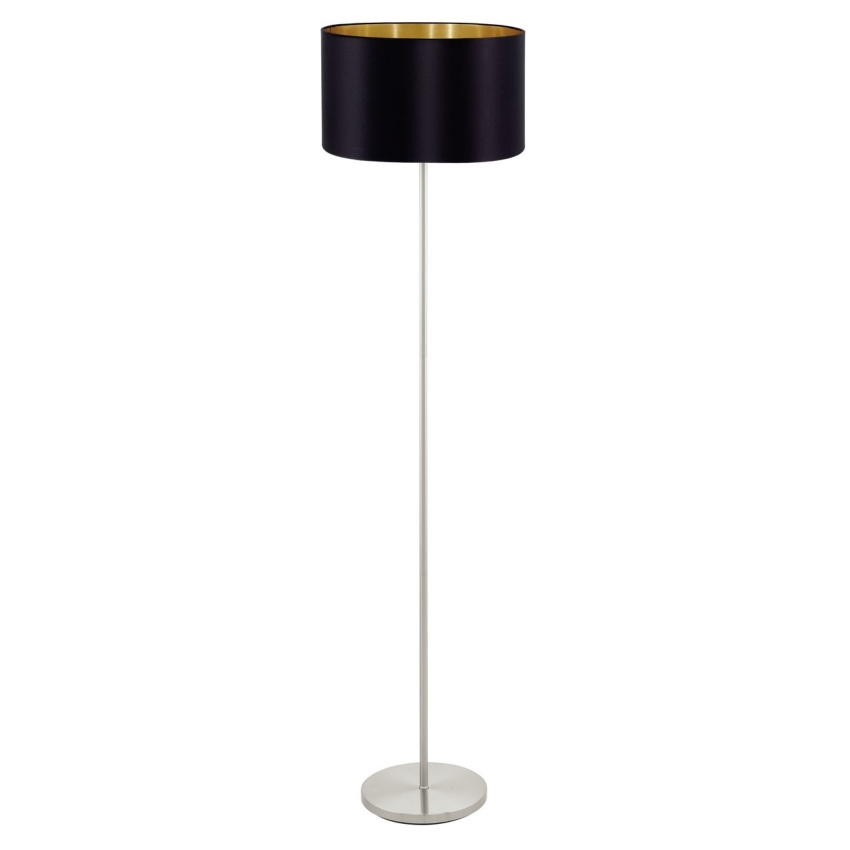 Stojací lampa MASERLO má kulaté černé látkové stínidlo se zlatým vnitřním povrchem a kovovou základnou z matného niklu. Podlahové svítidlo dokonale zapadne do minimalistických i moderních interiérů. Lampa se snadno zapíná a vypíná pomocí podlahového vypínače. Ať už v ložnici, obývacím pokoji nebo jídelně, poskytuje útulné osvětlení jakéhokoli prostoru. Žárovka není součástí dodávky. Výrobek má objímku žárovky E27 a vyžaduje žárovku E27.