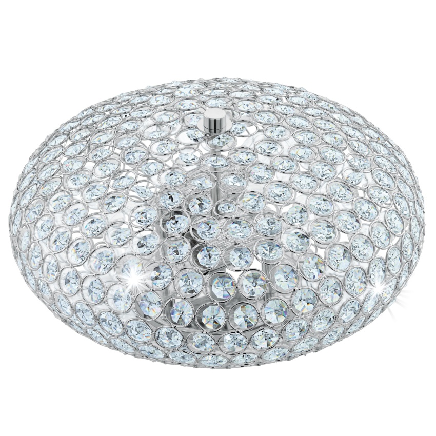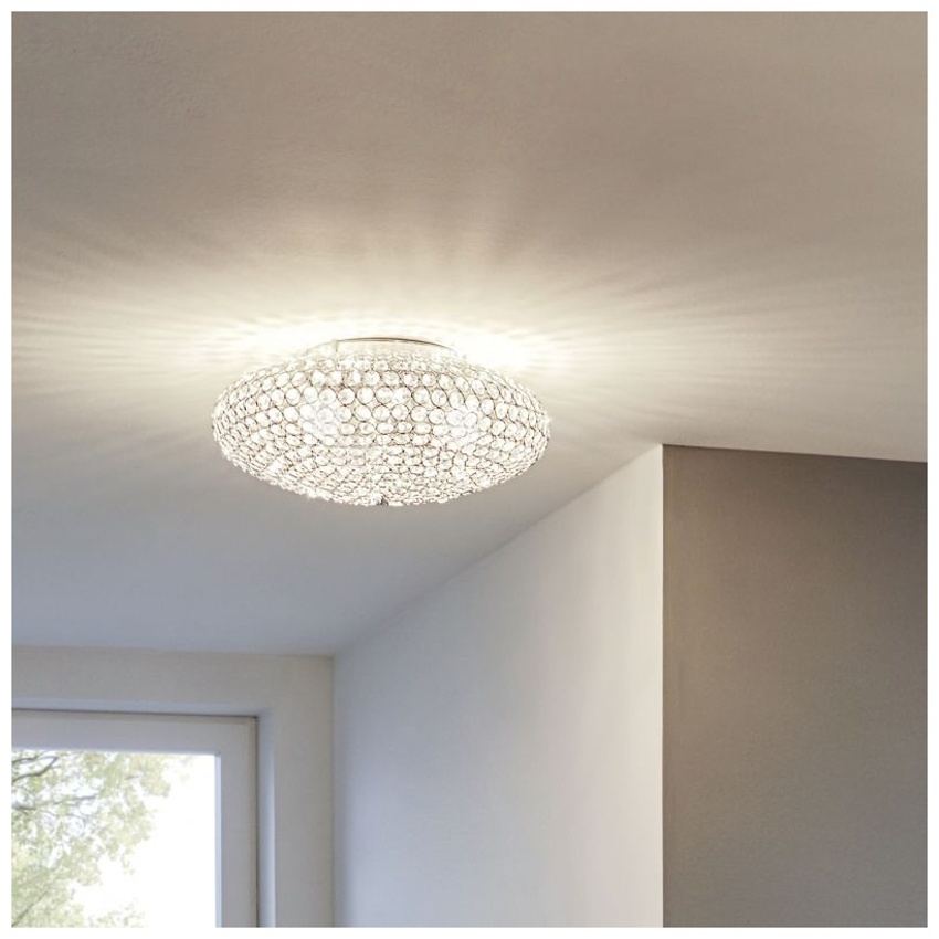 Stropní svítidlo CLEMENTE je vyrobeno z kovu v barvě chromu s oválným stínidlem z řad čirých krystalů. Prvotřídní křišťálové prvky vytvářejí jiskřivý, vysoce kvalitní vzhled, jakmile se lampa rozsvítí. Stropní svítidlo má průměr 35 cm a elegantně zapadne do moderních interiérů a vytvoří tu správnou náladu v každém prostoru, ať už v obývacím pokoji, ložnici nebo předsíni. Žárovky nejsou součástí dodávky. Výrobek má objímky žárovek E27 a vyžaduje 2 žárovky E27.