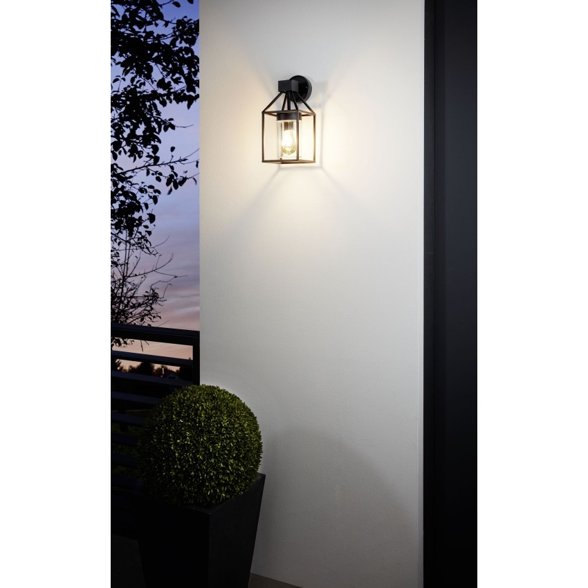 Moderní venkovní nástěnné svítidlo TRECATE ve stylu lucerny má pozinkovaný kovový rám v černé barvě. Design má viditelný styl žárovky. Výrobek je vhodný pro venkovní použití díky krytí IP44 proti stříkající vodě a má geometrický vzhled, který krásně doplní váš venkovní prostor. Vyobrazená žárovka s vláknem není součástí balení. Výrobek má objímku žárovky E27 a vyžaduje žárovku E27.
