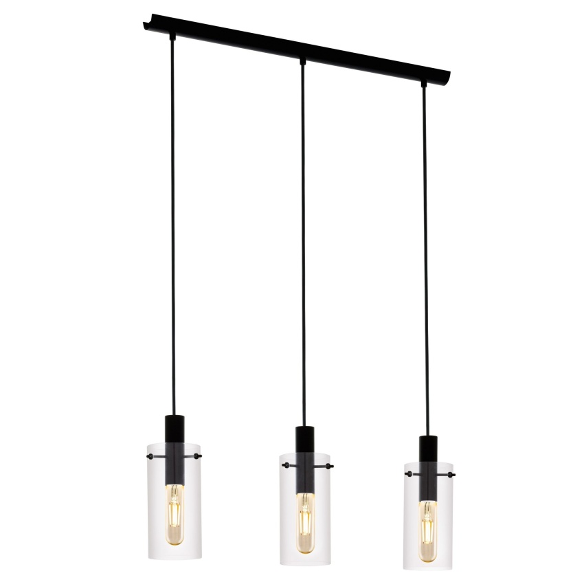 Závěsné svítidlo MONTEFINO se skládá ze tří závěsných cylindrů z čirého skla s černými kovovými objímkami. Výrobek má podlouhlý černý kovový kryt a viditelný styl žárovky. Závěsné svítidlo je dokonalým završením moderních stylů interiérového designu a vytváří stylové osvětlení v obývacím pokoji nebo jídelně. Vyobrazené žárovky s vláknem nejsou součástí dodávky. Výrobek má objímky žárovek E27 a vyžaduje žárovky E27.