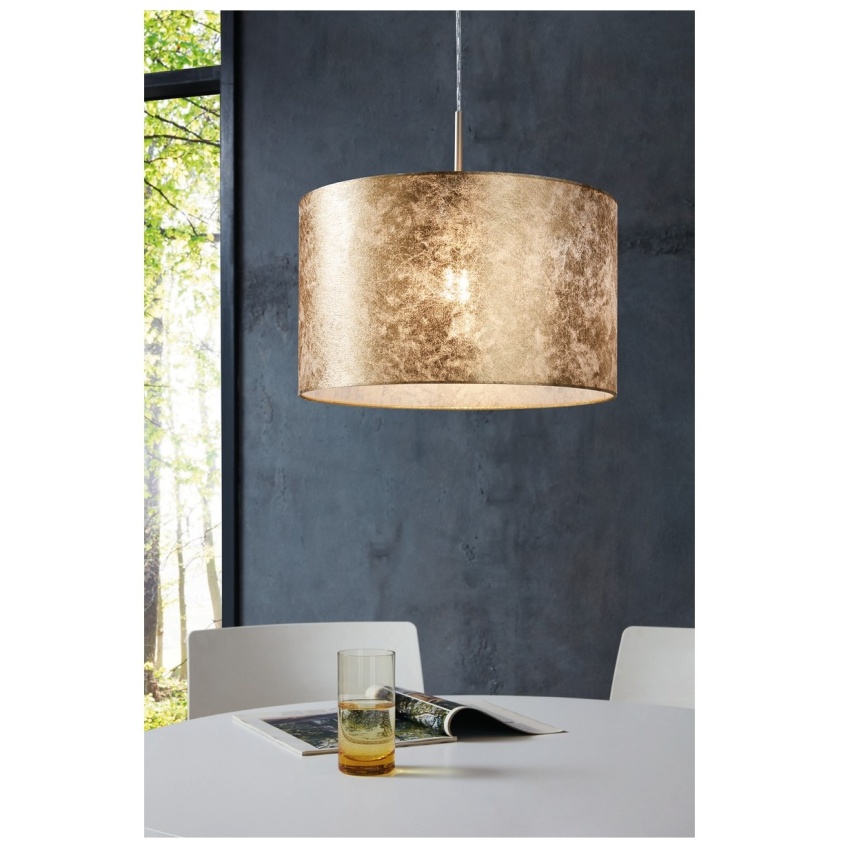 Závěsné svítidlo VISERBELLA má kulaté látkové stínidlo s povrchovou úpravou ve stylu zlatých listů a kovový stropní držák v barvě šampaňského. Design se skvěle hodí do moderních interiérů a poskytuje útulné osvětlení v obývacím pokoji nebo nad stolem v jídelně. Žárovka není součástí dodávky. Výrobek má objímku žárovky E27 a vyžaduje žárovku E27.