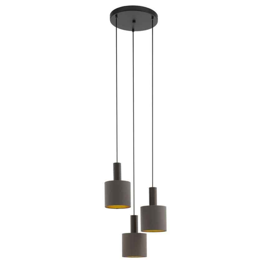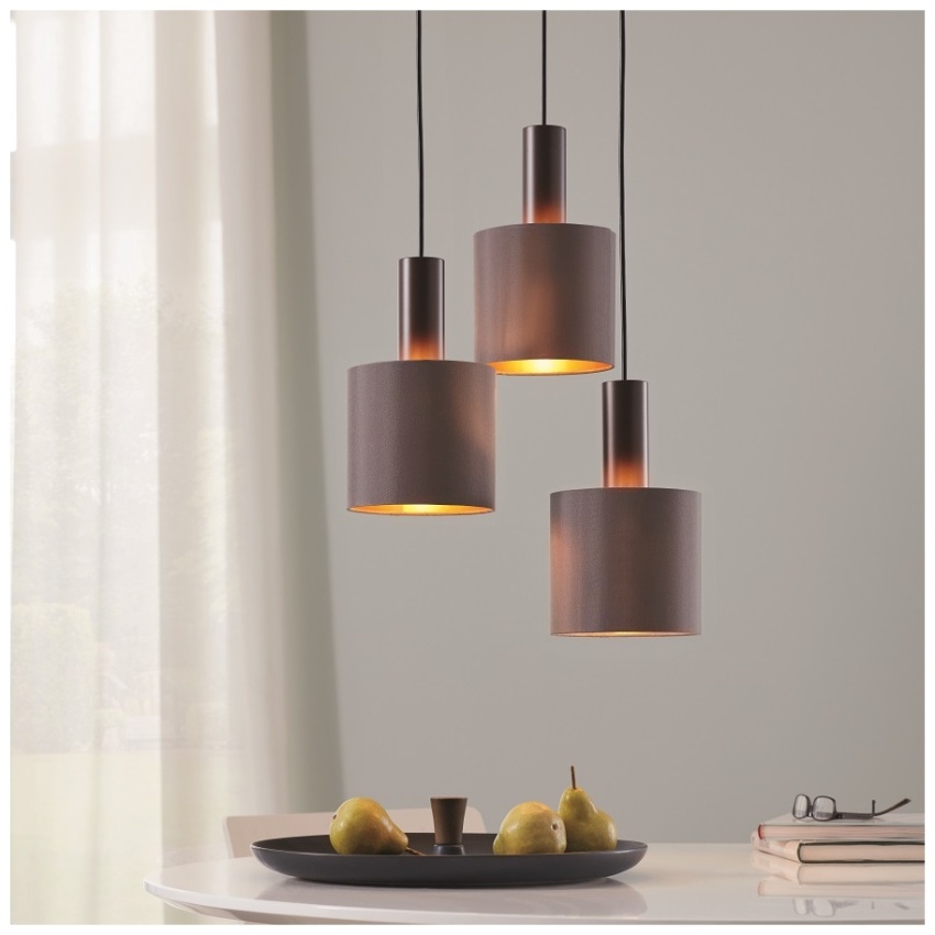 Závěsné svítidlo CONCESSA 1 má tři kulatá látková stínidla v barvě cappuccino se zlatým vnitřním povrchem, zavěšená v různých výškách. Tmavě hnědé kovové prvky na stínítkách a kovová stříška stejné barvy skvěle doplňují stylový vzhled svítidla. Závěsné svítidlo je krásným doplňkem každého moderního interiéru a poskytuje příjemné osvětlení v obývacím pokoji nebo jídelně. Žárovky nejsou součástí dodávky. Výrobek má objímku žárovky E27 a vyžaduje 1 žárovku E27.