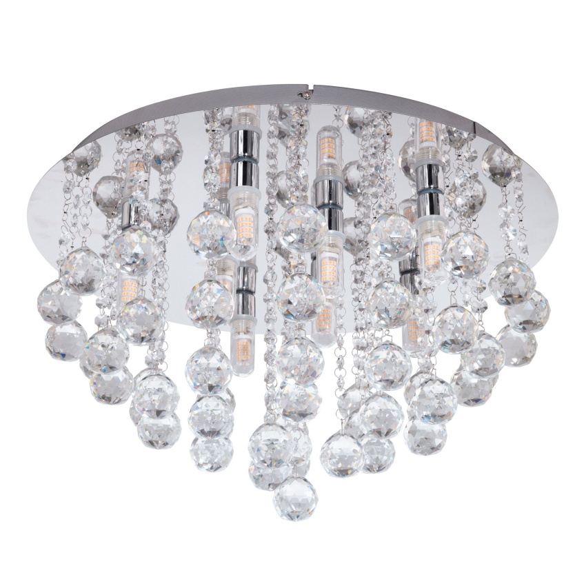Stropní LED svítidlo ALMONTE má kulatou kovovou základnu v chromové barvě ověšenou množstvím čirých krystalů. Prvotřídní křišťálové prvky vytvářejí jiskřivý, vysoce kvalitní vzhled, jakmile se rozsvítí světlo. Stropní svítidlo je vhodné pro použití v koupelně díky krytí IP44 proti stříkající vodě. Výrobek je dodáván včetně žárovek G9 LED, které produkují příjemné teplé bílé světlo.